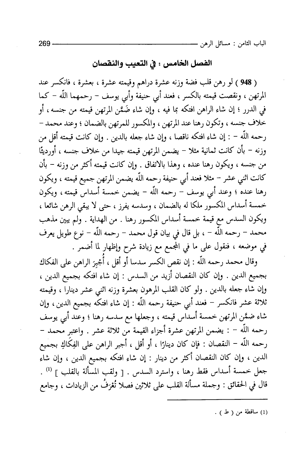 لو رهن قلب فضة وزنه عشرة دراهم وقيمته عشرة بعشرة فانكسر عند المرتهن ونقصت قيمته بالكسر فعند أبي حنيفة وأبي يوسف كما في الدرر إن شاء الراهن افتكه بما فيه وإن شاء ضمن المرتهن قيمته من جنسه أو خلاف جنسه وتكون رهنا عند المرتهن والمكسور للمرتهن بالضمان وعند محمد إن شاء افتكه ناقصا وإن شاء جعله بالدين وإن كانت قيمته أقل من وزنه بأن كانت ثمانية مثلا يضمن المرتهن قيمته جيدا من خلاف جنسه أو رديئا من جنسه ويكون رهنا عنده وهذا بالاتفاق وإن كانت قيمته أكثر من وزنه بأن كانت اثني عشر مثلا فعند أبي حنيفة يضمن المرتهن جميع قيمته ويكون رهنا عنده وعند أبي يوسف يضمن خمسة أسداس قيمته ويكون خمسة أسداس المكسور ملكا له بالضمان وسدسه يفرز حتى لا يبقى الرهن شائعا ويكون السدس مع قيمة خمسة أسداس المكسور رهنا. من الهداية. ولم يبين مذهب محمد بل قال في بيان قول محمد نوع طويل يعرف في موضعه فيقول على ما في المجمع مع زيادة شرح وإظهار لما أضمر وقال محمد إن نقص الكسر سدسا أو أقل أجبر الراهن على الفكاك بجميع الدين وإن كان النقصان أزيد من السدس إن شاء افتكه بجميع الدين وإن شاء جعله بالدين ولو كان القلب المرهون بعشرة وزنه اثني عشر دينارا وقيمته ثلاثة عشر فانكسر فعند أبي حنيفة إن شاء افتكه بجميع الدين وإن شاء ضمن المرتهن خمسة أسداس قيمته وجعلها مع سدسه رهنا وعند أبي يوسف يضمن المرتهن عشرة أجزاء القيمة من ثلاثة عشر واعتبر محمد النقصان فإن كان دينارا أو أقل أجبر الراهن على الفكاك بجميع الدين وإن كان النقصان أكثر من دينار إن شاء افتكه بجميع الدين وإن شاء جعل خمسة أسداس فقط رهنا واسترد السدس قال في الحقائق وجملة مسألة القلب على ثلاثين فصلا تعرف من الزيادات وجامع