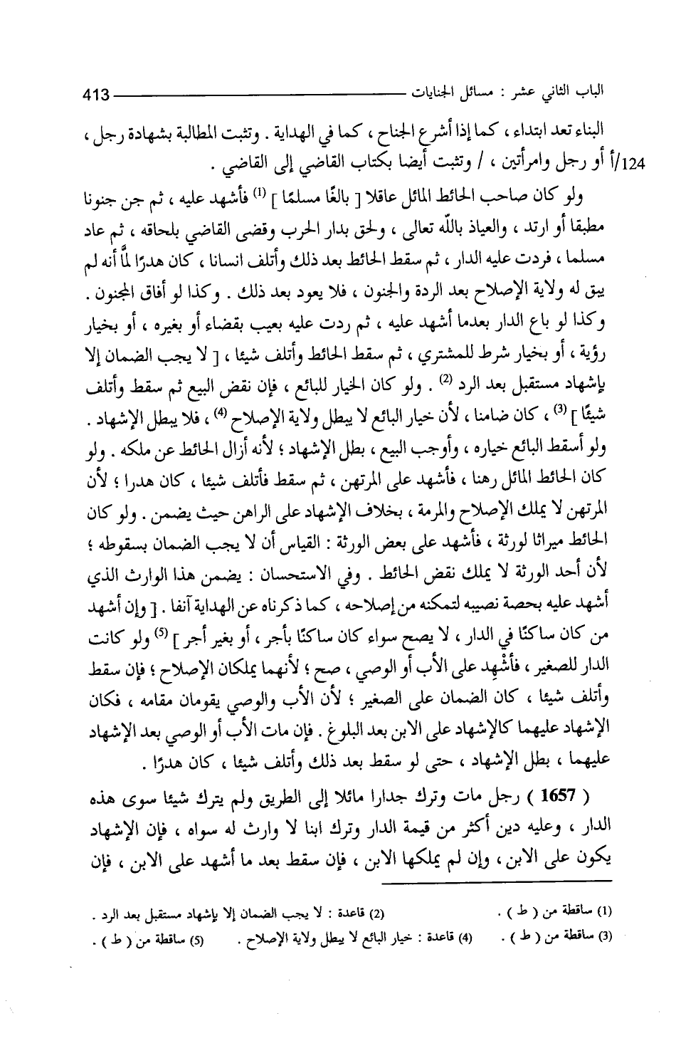 البناء تعد ابتداء كما إذا أشرع الجناح كما في الهداية وتثبت المطالبة بشهادة رجل أو رجل وامرأتين وتثبت أيضا بكتاب القاضي إلى القاضي ولو كان صاحب الحائط المائل عاقلا فأشهد عليه ثم جن جنونا مطبقا أو ارتد والعياذ بالله تعالى ولحق بدار الحرب وقضى القاضي بلحاقه ثم عاد مسلما فردت عليه الدار ثم سقط الحائط بعد ذلك وأتلف إنسانا كان هدرا لما أنه لم يبق له ولاية الإصلاح بعد الردة والجنون فلا يعود بعد ذلك وكذا لو أفاق المجنون وكذا لو باع الدار بعد ما أشهد عليه ثم ردت عليه بعيب بقضاء أو بغيره أو بخيار رؤية أو بخيار شرط للمشتري ثم سقط الحائط وأتلف شيئا كان ضامنا لأن خيار البائع لا يبطل ولاية الإصلاح فلا يبطل الإشهاد ولو أسقط البائع خياره وأوجب البيع بطل الإشهاد لأنه أزال الحائط عن ملكه ولو كان الحائط المائل رهنا فأشهد على المرتهن ثم سقط فأتلف شيئا كان هدرا لأن المرتهن لا يملك الإصلاح والمرمة بخلاف الإشهاد على الراهن حيث يضمن ولو كان الحائط ميراثا لورثة فأشهد على بعض الورثة القياس أن لا يجب الضمان بسقوطه لأن أحد الورثة لا يملك نقض الحائط وفي الاستحسان يضمن هذا الوارث الذي أشهد عليه بحصة نصيبه لتمكنه من إصلاحه كما ذكرناه عن الهداية آنفا ولو كانت الدار الصغير فأشهد على الأب أو الوصي صح لأنهما يملكان الإصلاح فإن سقط وأتلف شيئا كان الضمان على الصغير لأن الأب والوصي يقومان مقامه فكان الإشهاد عليهما كالإشهاد على الابن بعد البلوغ فإن مات الأب أو الوصي بعد الإشهاد عليهما بطل الإشهاد حتى لو سقط بعد ذلك وأتلف شيئا كان هدرا رجل مات وترك جدارا مائلا إلى الطريق ولم يترك شيئا سوى هذه الدار وعليه دين أكثر من قيمة الدار وترك ابنا لا وارث له سواه فإن الإشهاد يكون على الابن وإن لم يملكها الابن فإن سقط بعد ما أشهد على الابن فإن
