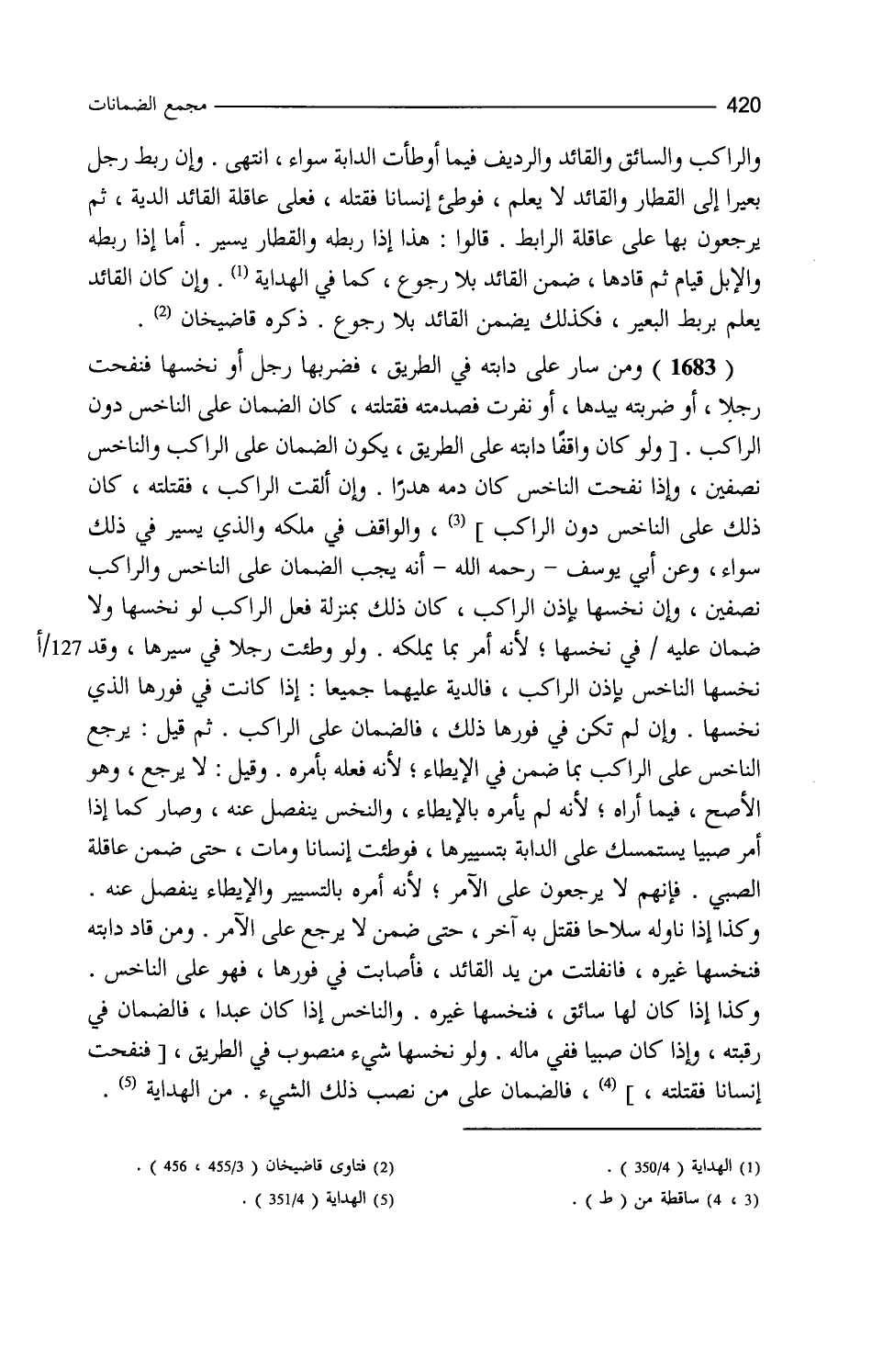 والراكب والسائق والقائد والرديف فيما أوطأت الدابة سواء انتهى وإن ربط رجل بعير إلى القطار والقائد لا يعلم فوطئ إنسانا فقتله فعلى عاقلة القائد الدية ثم يرجعون بها على عاقلة الرابط قالوا هذا إذا ربطه والقطار يسير أما إذا ربطه والإبل قيام ثم قادها ضمن القائد بلا رجوع كما في الهداية وإن كان القائد يعلم بربط البعير فكذلك يضمن القائد بلا رجوع ذكره قاضي خان ومن سار على دابته في الطريق فضربها رجل أو نخسها فنفحت رجلا أو ضربته بيدها أو نفرت فصدمته فقتلته كان الضمان على الناخس دون الراكب والواقف في ملكه والذي يسير في ذلك سواء وعن أبي يوسف أنه يجب الضمان على الناخس والراكب نصفين وإن نخسها بإذن الراكب كان ذلك بمنزلة فعل الراكب لو نخسها ولا ضمان عليه في نخسها لأنه أمر بما يملكه ولو وطئت رجلا في سيرها وقد نخسها الناخس بإذن الراكب فالدية عليهما جميعا إذا كانت في فورها الذي نخسها وإن لم تكن في فورها ذلك فالضمان على الراكب ثم قيل يرجع الناخس على الراكب بما ضمن في الإيطاء لأنه فعله بأمره وقيل لا يرجع وهو الأصح فيما أراه لأنه لم يأمره بالإيطاء والنخس ينفصل عنه وصار كما إذا أمر صبيا يستمسك على الدابة بتسييرها فوطئت إنسانا ومات حتى ضمن عاقلة الصبي فإنهم لا يرجعون على الآمر لأنه أمره بالتسيير والإيطاء ينفصل عنه وكذا إذا ناوله سلاحا فقتل به آخر حتى ضمن لا يرجع على الآمر ومن قاد دابته فنخسها غيره فانفلتت من يد القائد فأصابت في فورها فهو على الناخس وكذا إذا كان لها سائق فنخسها غيره والناخس إذا كان عبدا فالضمان في رقبته وإذا كان صبيا ففي ماله ولو نخسها شيء منصوب في الطريق فالضمان على من نصب ذلك الشيء من الهداية