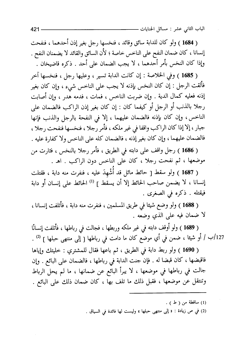 ولو كان للدابة سائق وقائد فنخسها رجل بغير إذن أحدهما فنفحت إنسانا كان ضمان النفح على الناخس خاصة لأن السائق والقائد لا يضمنان النفح وإذا كان النخس بأمر أحدهما لا يجب الضمان على أحد ذكره قاضي خان وفي الخلاصة إن كانت الدابة تسير وعليها رجل فنخسها آخر فألقت الرجل إن كان النخس بإذنه لا يجب على الناخس شيء وإن كان بغير إذنه فعليه كمال الدية وإن ضربت الناخس فمات فدمه هدر وإن أصابت رجلا بالذنب أو الرجل أو كيفما كان إن كان بغير إذن الراكب فالضمان على الناخس وإن كان بإذنه فالضمان عليهما إلا في النفحة بالرجل والذنب فإنها جبار إلا إذا كان الراكب واقفا في غير ملكه فأمر رجلا فنخسها فنفحت رجلا فالضمان عليهما وإن كان بغير إذنه فالضمان كله على الناخس ولا كفارة عليه رجل واقف على دابته في الطريق فأمر رجلا بالنخس فثارت من موضعها ثم نفحت رجلا كان على الناخس دون الراكب ا هـ ولو سقط الحائط على إنسان أو دابة فيقتله ذكره في الصغرى ولو وضع شيئا في طريق المسلمين فنفرت منه دابة فأتلفت إنسانا لا ضمان فيه على الذي وضعه ولو أوقف دابته في غير ملكه وربطها فجالت في رباطها فأتلفت إنسانا أو شيئا ضمن في أي موضع كان ما دامت في رباطها ولو ربط دابة في الطريق ثم باعها فقال للمشتري خليتك وإياها فاقبضها كان قبضا له فإن جنت الدابة في رباطها فالضمان على البائع وإن جالت في رباطها في موضعها لا يبرأ البائع عن ضمانها ما لم تحل الرباط وتنتقل عن موضعها فقبل ذلك ما تلف بها كان ضمان ذلك على البائع