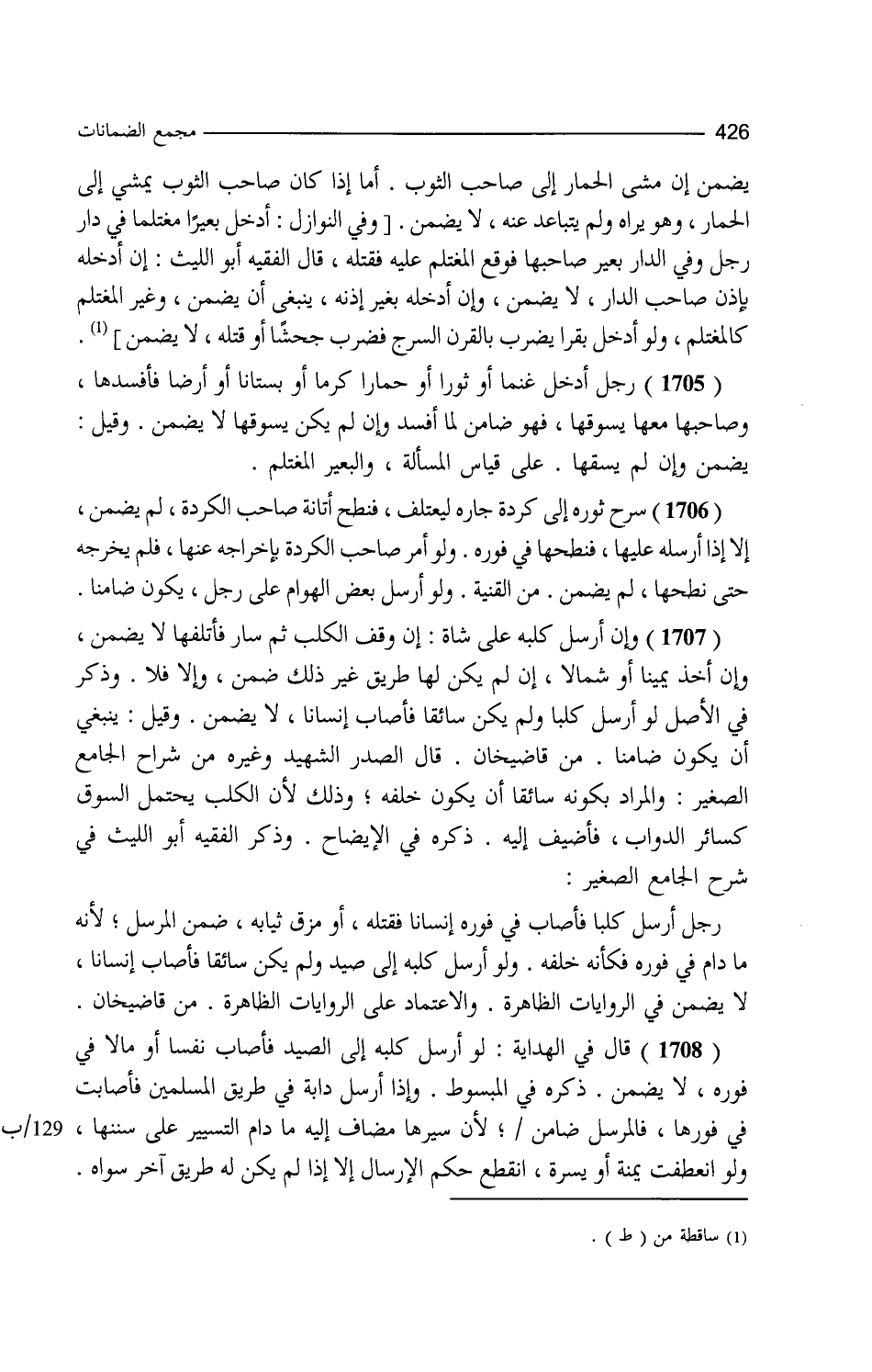 يضمن إن مشى الحمار إلى صاحب الثوب أما إذا كان صاحب الثوب يمشي إلى الحمار وهو يراه ولم يتباعد عنه لا يضمن رجل أدخل غنما أو ثورا أو حمارا كرما أو بستانا أو أرضا فأفسدها وصاحبها معها يسوقها فهو ضامن لما أفسد وإن لم يكن يسوقها لا يضمن وقيل يضمن وإن لم يسقها على قياس المسألة والبعير المغتلم سرح ثوره إلى كردة جاره ليعتلف فنطح أتانه صاحب الكردة لم يضمن إلا إذا أرسله عليها فنطحها في فوره ولو أمر صاحب الكردة بإخراجه عنها فلم يخرجه حتى نطحها لم يضمن. من القنية. ولو أرسل بعض الهوام على رجل يكون ضامنا وإن أرسل كلبه على شاة إن وقف الكلب ثم سار فأتلفها لا يضمن وإن أخذ يمينا أو شمالا إن لم يكن لها طريق غير ذلك ضمن وإلا فلا وذكر في الأصل لو أرسل كلبا ولم يكن سائقا فأصاب إنسانا لا يضمن وقيل ينبغي أن يكون ضامنا. من قاضي خان. قال الصدر الشهيد وغيره من شراح الجامع الصغير والمراد بكونه سائقا أن يكون خلفه وذلك لأن الكلب يحتمل السوق كسائر الدواب فأضيف إليه ذكره في الإيضاح وذكر الفقيه أبو الليث في شرح الجامع الصغير رجل أرسل كلبا فأصاب في فوره إنسانا فقتله أو مزق ثيابه ضمن المرسل لأنه ما دام في فوره فكأنه خلفه ولو أرسل كلبه إلى صيد ولم يكن سائقا فأصاب إنسانا لا يضمن في الروايات الظاهرة والاعتماد على الروايات الظاهرة. من قاضي خان. قال في الهداية لو أرسل كلبه إلى الصيد فأصاب نفسا أو مالا في فوره لا يضمن ذكره في المبسوط وإذا أرسل دابة في طريق المسلمين فأصابت في فورها فالمرسل ضامن لأن سيرها مضاف إليه ما دام التسيير على سننها ولو انعطفت يمنة أو يسرة انقطع حكم الإرسال إلا إذا لم يكن له طريق آخر سواه
