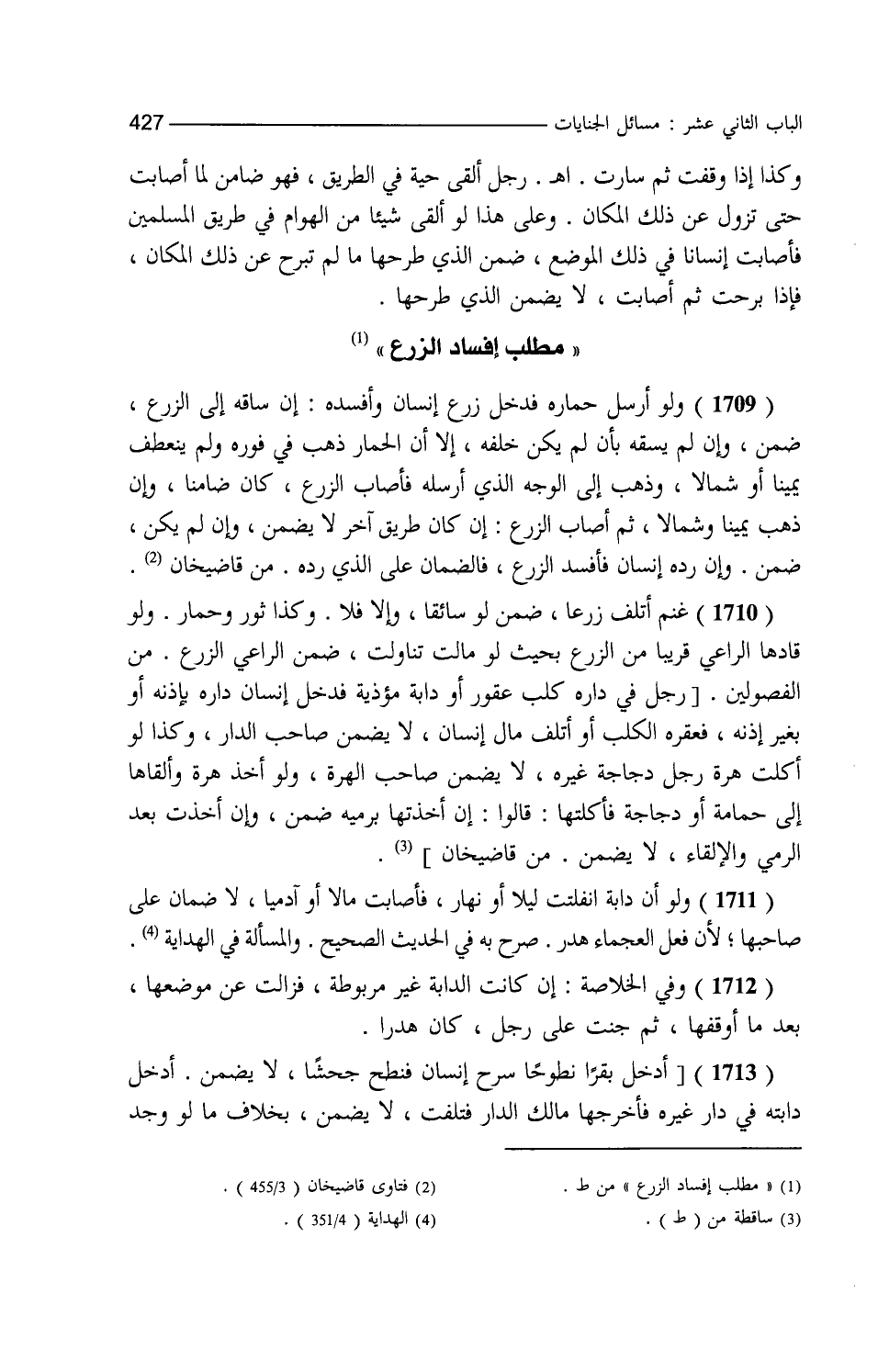 وكذا إذا وقفت ثم سارت ا هـ رجل ألقى حية في الطريق فهو ضامن لما أصابت حتى تزول عن ذلك المكان وعلى هذا لو ألقى شيئا من الهوام في طريق المسلمين فأصابت إنسانا في ذلك الموضع ضمن الذي طرحها ما لم تبرح عن ذلك المكان فإذا برحت ثم أصابت لا يضمن الذي طرحها مطلب إفساد الزرع ولو أرسل حماره فدخل زرع إنسان وأفسده إن ساقه إلى الزرع ضمن وإن لم يسقه بأن لم يكن خلفه إلا أن الحمار ذهب في فوره ولم ينعطف يمينا أو شمالا وذهب إلى الوجه الذي أرسله فأصاب الزرع كان ضامنا وإن ذهب يمينا وشمالا ثم أصاب الزرع إن كان طريق آخر لا يضمن وإن لم يكن ضمن وإن رده إنسان فأفسد الزرع فالضمان على الذي رده. من قاضي خان. غنم أتلف زرعا ضمن لو سائقا وإلا فلا وكذا ثور وحمار ولو قادها الراعي قريبا من الزرع بحيث لو مالت تناولت ضمن الراعي الزرع. من الفصولين. ولو أن دابة انفلتت ليلا أو نهارا فأصابت مالا أو آدميا لا ضمان على صاحبها لأن فعل العجماء هدر صرح به في الحديث الصحيح والمسألة في الهداية وفي الخلاصة إن كانت الدابة غير مربوطة فزالت عن موضعها بعد ما أوقفها ثم جنت على رجل كان هدرا لو وجد في زرعه أو كرمه دابة وقد أفسدت زرعه فحبسها فهلكت ضمن صاحب الكرم. من الخلاصة. دخلت دابته زرع غيره تفسده ولو دخله ليخرجها يفسده أيضا لكن أقل من الدابة يجب عليه إخراجها ويضمن ما أتلفت ولو كانت دابة غيره لا يجب ولو أخرجها فهلكت لا يضمن لأنه مأذون في ذلك دلالة من الجانبين رأى حماره يأكل حنطة غيره فلم يمنعه حتى أكلها ففيه اختلاف المشايخ والصحيح أنه يضمن. من القنية. إذا رأى في زرعه دابة فأخرجها فمقدار ما يخرجها عن ملكه لا يكون مضمونا فإذا ساقها وراء ذلك القدر يصير ضامنا بنفس السوق هكذا ذكره علي السغدي وتبعه أبو نصر إلا أنه قال إذا ساقها في أي موضع يأمن فيها لا يكون ضامنا وقال بعضهم إذا وجد الرجل دابة في زرعه فأخرجها فقتلها سبع كان ضامنا لأنه لا ينبغي أن يخرجها ولكن ينبغي أن يستعدي على صاحبها والصحيح ما قاله الإمام علي السغدي إن له أن يخرجها عن ملكه ولا يسوقها وراء ذلك فإن ساقها بعد ما أخرجها عن ملكه يصير ضامنا. من قاضي خان. وفي الصغرى قال الليث ولسنا نأخذ بقول من يقول لا ينبغي له أن يخرجها بل نأخذ بما روي عن محمد بن الحسن أنه قال لا يضمن لو أخرجها لأن لصاحب الزرع أن يخرج الدابة من زرعه ولا يسوقها أكثر من ذلك ا هـ وإن ساقها ليردها فعطبت في الطريق وانكسر رجلها كان ضامنا ولو أن صاحب الزرع لم يخرجها ولكنه أمر صاحبها أن يخرجها فأفسدت شيئا في إخراجها قال الفقيه أبو الليث لا يكون ضامنا لما أفسدت لأنه أخرجها بأمره ولو أنه قال لصاحب الدابة دابتك في الزرع ولم يقل أخرجها فأخرجها صاحبها فأفسدت شيئا في إخراجها كان ضامنا وقال أبو نصر في الوجه الأول يكون ضامنا أيضا لوجود السوق من صاحبها وصاحب الزرع لم يضمن بالفساد وإنما طلب منه الصيانة. من قاضي خان. ولو أن صاحب الزرع حمل على دابة وجدها في زرعه فأسرعت ضمن ما أصابت وكذا لو تبعها كثيرا بعد ما أخرجها فذهبت ضمن ولو أخرجها أجنبي قال أبو نصر أرجو أن لا يضمن وعن بعضهم يضمن ذكره في الفصولين وبعض هذه المسائل في الغصب وقد مر فيه حكم ما لو وجد في زرعه ثورين ليلا فظن أنهما لأهل قريته فساقهما إلى مربطه وضاع أحدهما فليطلب هناك دخل زرعه جمل غيره مرارا ولا يطيق منعه فحبسه حتى يجيء صاحبه ثم غاب الجمل من الإصطبل فوجد مكسور الرجل فإن لم ينكسر في حبسه قالوا لا يضمن وقد قالوا يضمن ما لم يسلمه إلى صاحبه فالرأي فيه إلى القاضي. من القنية. أدخل بقرا نطوحا بسرح إنسان فنطح جحشا لا يضمن أدخل دابته في دار غيره فأخرجها مالك الدار فتلفت لا يضمن بخلاف ما لو وجد