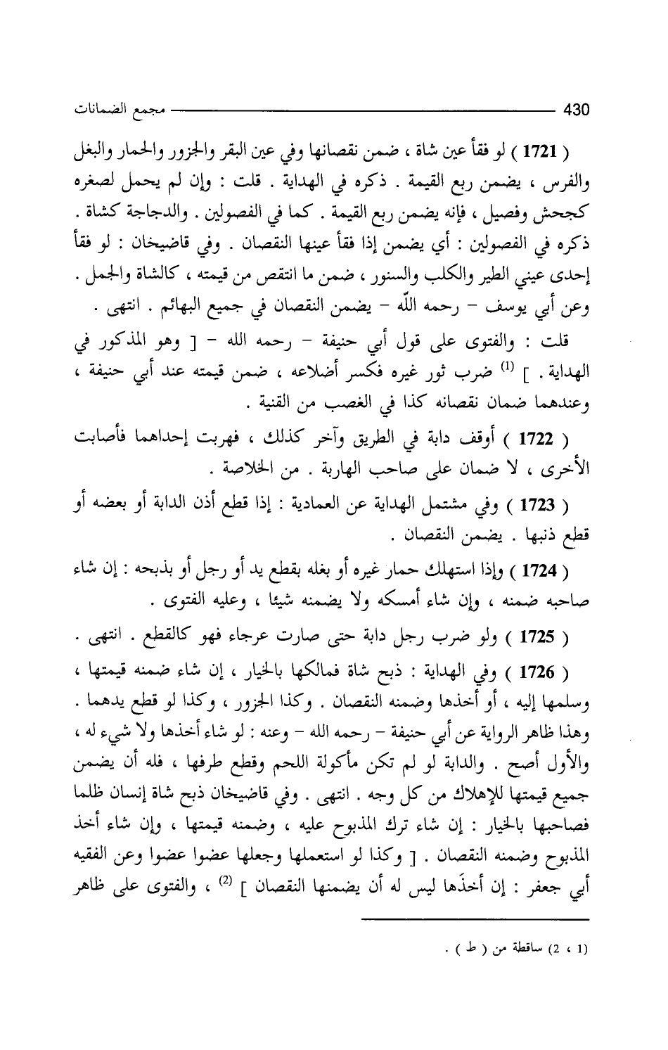 لو فقأ عين شاة ضمن نقصانها وفي عين البقر والجزور والحمار والبغل والفرس يضمن ربع القيمة ذكره في الهداية قلت وإن لم يحمل لصغره كجحش وفصيل فإنه يضمن ربع القيمة كما في الفصولين والدجاجة كشاة ذكره في الفصولين أي يضمن إذا فقأ عينها النقصان وفي قاضي خان لو فقأ إحدى عيني الطير والكلب والسنور ضمن ما انتقص من قيمته كالشاة والجمل وعن أبي يوسف يضمن النقصان في جميع البهائم انتهى قلت والفتوى على قول أبي حنيفة وعندهما نقصانه كذا في الغصب. من القنية. أوقف دابة في الطريق وآخر كذلك فهربت إحداهما فأصابت الأخرى لا ضمان على صاحب الهاربة. من الخلاصة. وفي مشتمل الهداية عن العمادية إذا قطع أذن الدابة أو بعضه أو قطع ذنبها يضمن النقصان وإذا استهلك حمار غيره أو بغله بقطع يد أو رجل أو بذبحه إن شاء صاحبه ضمنه وإن شاء أمسكه ولا يضمنه شيئا وعليه الفتوى ولو ضرب رجل دابة حتى صارت عرجاء فهو كالقطع انتهى وفي الهداية ذبح شاة فمالكها بالخيار إن شاء ضمنه قيمتها وسلمها إليه أو أخذها وضمنه النقصان وكذا الجزور وكذا لو قطع يدهما وهذا ظاهر الرواية عن أبي حنيفة وعنه لو شاء أخذها ولا شيء له والأول أصح والدابة لو لم تكن مأكولة اللحم وقطع طرفها فله أن يضمن جميع قيمتها للإهلاك من كل وجه انتهى وفي قاضي خان ذبح شاة إنسان ظلما فصاحبها بالخيار إن شاء ترك المذبوح عليه وضمنه قيمتها وإن شاء أخذ المذبوح وضمنه النقصان والفتوى على ظاهر