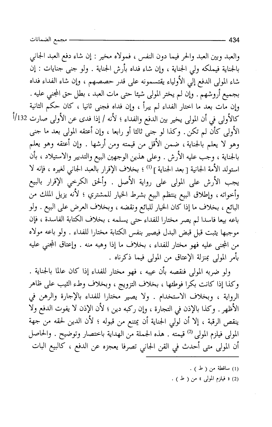 والعبد وبين العبد والحر فيما دون النفس فمولاه مخير إن شاء دفع العبد الجاني بالجناية فيملكه ولي الجناية وإن شاء فداه بأرش الجناية ولو جنى جنايات إن شاء المولى الدفع إلى الأولياء يقتسمونه على قدر حصصهم وإن شاء الفداء فداه بجميع أروشهم وإن لم يختر المولى شيئا حتى مات العبد بطل حق المجني عليه وإن مات بعد ما اختار الفداء لم يبرأ وإن فداه فجنى ثانيا كان حكم الثانية كالأولى في أن المولى يخير بين الدفع والفداء لأنه إذا فدى عن الأولى صارت الأولى كأن لم تكن وكذا لو جنى ثالثا أو رابعا وإن أعتقه المولى بعد ما جنى وهو لا يعلم بالجناية ضمن الأقل من قيمته ومن أرشها وإن أعتقه وهو يعلم بالجناية وجب عليه الأرش وعلى هذين الوجهين البيع والتدبير والاستيلاد بأن استولد الأمة الجانية بخلاف الإقرار بالعبد الجاني لغيره فإنه لا يجب الأرش على المولى على رواية الأصل وألحق الكرخي الإقرار بالبيع وأخواته وإطلاق البيع ينتظم البيع بشرط الخيار للمشتري لأنه يزيل الملك من البائع بخلاف ما إذا كان الخيار للبائع ونقضه وبخلاف العرض على البيع ولو باعه بيعا فاسدا لم يصر مختارا للفداء حتى يسلمه بخلاف الكتابة الفاسدة فإن موجبها يثبت قبل قبض البدل فيصير بنفس الكتابة مختارا للفداء ولو باعه مولاه من المجني عليه فهو مختار للفداء بخلاف ما إذا وهبه منه وإعتاق المجني عليه بأمر المولى بمنزلة الإعتاق من المولى فيما ذكرناه ولو ضربه المولى فنقصه بأن عيبه فهو مختار للفداء إذا كان عالما بالجناية وكذا إذا كانت بكرا فوطئها بخلاف التزويج وبخلاف وطء الثيب على ظاهر الرواية وبخلاف الاستخدام ولا يصير مختارا للفداء بالإجارة والرهن في الأظهر وكذا بالإذن في التجارة وإن ركبه دين لأن الإذن لا يفوت الدفع ولا ينقص الرقبة إلا أن لولي الجناية أن يمتنع من قبوله لأن الدين لحقه من جهة المولى فيلزم المولى قيمته هذه الجملة. من الهداية. باختصار وتوضيح والحاصل أن المولى متى أحدث في القن الجاني تصرفا يعجزه عن الدفع كالبيع البات