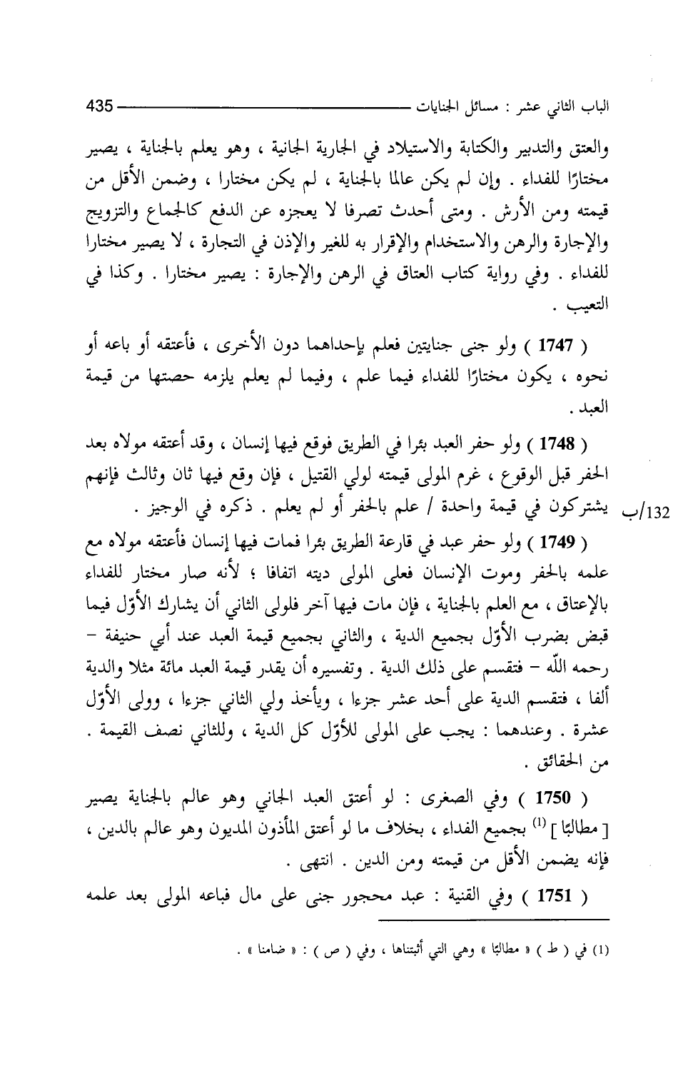 والعتق والتدبير والكتابة والاستيلاد وفي الجارية الجانية وهو يعلم بالجناية يصير مختارا للفداء وإن لم يكن عالما بالجناية لم يكن مختارا وضمن الأقل من قيمته ومن الأرش ومتى أحدث تصرفا لا يعجزه عن الدفع كالجماع والتزويج والإجارة والرهن والاستخدام والإقرار به للغير والإذن في التجارة لا يصير مختارا للفداء وفي رواية كتاب العتاق في الرهن والإجارة يصير مختارا وكذا في التعيب ولو جنى جنايتين فعلم بإحداهما دون الأخرى فأعتقه أو باعه أو نحوه يكون مختارا للفداء فيما علم وفيما لم يعلم يلزمه حصتها من قيمة العبد ولو حفر العبد بئرا في الطريق فوقع فيها إنسان وقد أعتقه مولاه بعد الحفر قبل الوقوع غرم المولى قيمته لولي القتيل فإن وقع فيها ثان وثالث فإنهم يشتركون في قيمة واحدة علم بالحفر أو لم يعلم ذكره في الوجيز ولو حفر عبد في قارعة الطريق بئرا فمات فيها إنسان فأعتقه مولاه مع علمه بالحفر وموت الإنسان فعلى المولى ديته اتفاقا لأنه صار مختارا للفداء بالإعتاق مع العلم بالجناية فإن مات فيها آخر فلولي الثاني أن يشارك الأول فيما قبض بضرب الأول بجميع الدية والثاني بجميع قيمة العبد عند أبي حنيفة فتقسم على ذلك الدية وتفسيره أن يقدر قيمة العبد مائة مثلا والدية ألفا فتقسم الدية على أحد عشر جزءا ويأخذ ولي الثاني جزءا وولي الأول عشرة وعندهما يجب على المولى للأول كل الدية وللثاني نصف القيمة من الحقائق وفي الصغرى لو أعتق العبد الجاني وهو عالم بالجناية يصير مطالبا بجميع الفداء بخلاف ما لو أعتق المأذون المديون وهو عالم بالدين فإنه يضمن الأقل من قيمته ومن الدين انتهى وفي القنية عبد محجور جنى على مال فباعه المولى بعد علمه
