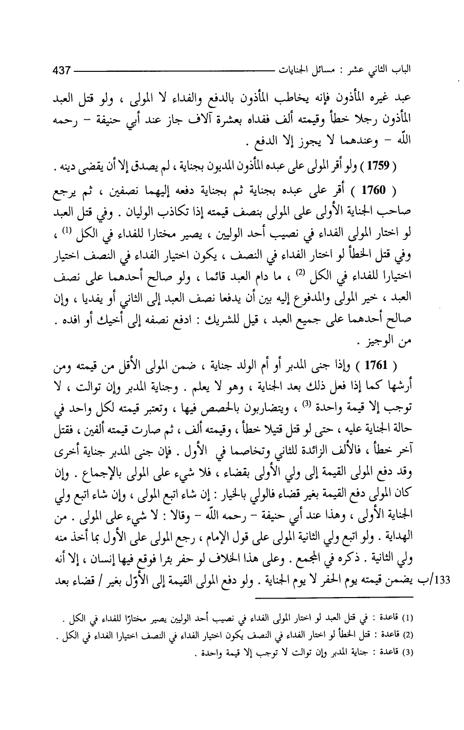 أقر على عبده بجناية ثم بجناية دفعه إليهما نصفين ثم يرجع صاحب الجناية الأولى على المولى بنصف قيمته إذا تكاذب الوليان وفي قتل العبد العمد لو اختار المولى الفداء في نصيب أحد الوليين يصير مختارا للفداء في الكل وفي قتل الخطأ لو اختار الفداء في النصف يكون اختيار الفداء في النصف اختيارا للفداء في الكل ما دام العبد قائما ولو صالح أحدهما على نصف العبد خير المولى والمدفوع إليه بين أن يدفعا نصف العبد إلى الثاني أو يفديا وإن صالح أحدهما على جميع العبد قيل للشريك ادفع نصفه إلى أخيك أو افده. من الوجيز. وإذا جنى المدبر أو أم الولد جناية ضمن المولى الأقل من قيمته ومن أرشها كما إذا فعل ذلك بعد الجناية وهو لا يعلم وجناية المدبر وإن توالت لا توجب إلا قيمة واحدة ويتضاربون بالحصص فيها وتعتبر قيمته لكل واحد في حالة الجناية عليه حتى لو قتل قتيلا خطأ وقيمته ألف ثم صارت قيمته ألفين فقتل آخر خطأ فالألف الزائدة للثاني وتخاصما في الأول فإن جنى المدبر جناية أخرى وقد دفع المولى القيمة إلى ولي الأولى بقضاء فلا شيء على المولى بالإجماع وإن كان المولى دفع القيمة بغير قضاء فالولي بالخيار إن شاء اتبع المولى وإن شاء اتبع ولي الجناية الأولى وهذا عند أبي حنيفة وقالا لا شيء على المولى. من الهداية. ولو اتبع ولي الثانية المولى على قول الإمام رجع المولى على الأول بما أخذ منه ولي الثانية ذكره في المجمع وعلى هذا الخلاف لو حفر بئرا فوقع فيها إنسان إلا أنه يضمن قيمته يوم الحفر لا يوم الجناية ولو دفع المولى القيمة إلى الأول بغير قضاء بعد