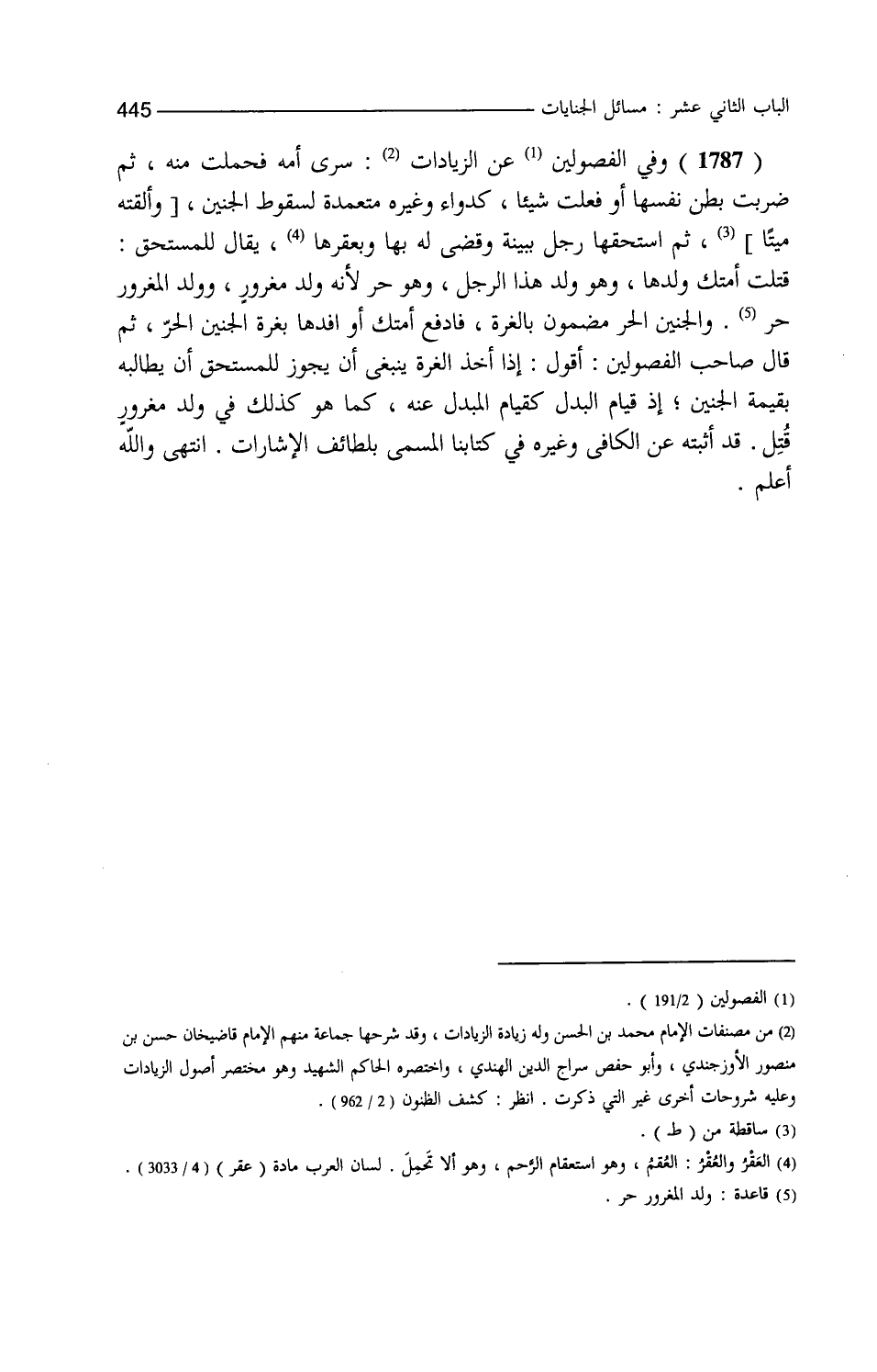 وفي الفصولين عن الزيادات شرى أمة فحملت منه ثم ضربت بطن نفسها أو فعلت شيئا كدواء وغيره متعمدة لسقوط الجنين ثم استحقها رجل ببينة وقضي له بها وبعقرها يقال للمستحق قتلت أمتك ولدها وهو ولد هذا الرجل وهو حر لأنه ولد مغرور وولد المغرور حر والجنين الحر مضمون بالغرة فادفع أمتك أو افدها بغرة الجنين الحر ثم قال صاحب الفصولين أقول إذا أخذ الغرة ينبغي أن يجوز للمستحق أن يطالبه بقيمة الجنين إذ قيام البدل كقيام المبدل عنه كما هو كذلك في ولد مغرور قتل قد أثبته عن الكافي وغيره في كتابنا المسمى بلطائف الإشارات انتهى والله أعلم