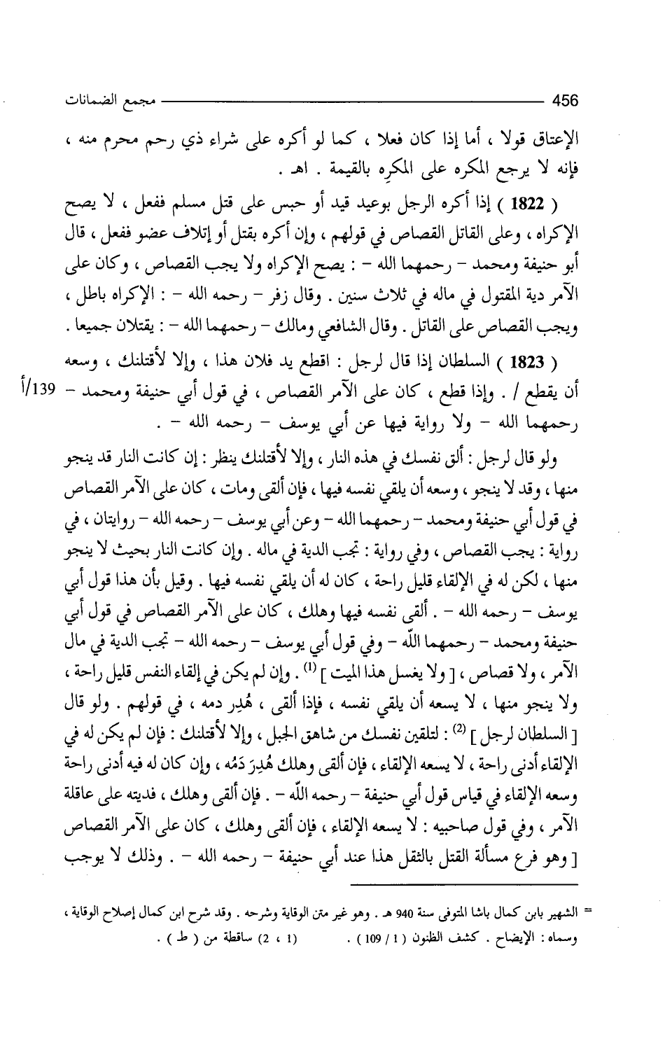الإعتاق قولا أما إذا كان فعلا كما لو أكره على شراء ذي رحم محرم منه فإنه لا يرجع المكره على المكره بالقيمة ا هـ إذا أكره الرجل بوعيد قيد أو حبس على قتل مسلم ففعل لا يصح الإكراه وعلى القاتل القصاص في قولهم وإن أكره بقتل أو إتلاف عضو ففعل قال أبو حنيفة ومحمد يصح الإكراه ولا يجب القصاص وكان على الآمر دية المقتول في ماله في ثلاث سنين وقال زفر الإكراه باطل ويجب القصاص على القاتل وقال الشافعي ومالك يقتلان جميعا السلطان إذا قال لرجل اقطع يد فلان هذا وإلا لأقتلنك وسعه أن يقطع وإذا قطع كان على الآمر القصاص في قول أبي حنيفة ومحمد ولا رواية فيها عن أبي يوسف ولو قال لرجل ألق نفسك في هذه النار وإلا لأقتلنك ينظر إن كانت النار قد ينجو منها وقد لا ينجو وسعه أن يلقي نفسه فيها فإن ألقى ومات على الآمر القصاص وفي قول أبي حنيفة ومحمد وعن أبي يوسف روايتان في رواية يجب القصاص وفي رواية تجب الدية في ماله وإن كانت النار بحيث لا ينجو منها لكن له في الإلقاء قليل راحة كان له أن يلقي نفسه فيها وقيل بأن هذا قول أبي يوسف فإن ألقى نفسه فيها وهلك كان على الآمر القصاص في قول أبي حنيفة ومحمد وفي قول أبي يوسف تجب الدية في مال الآمر ولا قصاص وإن لم يكن في إلقاء النفس قليل راحة ولا ينجو منها لا يسعه أن يلقي نفسه فإذا ألقى هدر دمه في قولهم ولو قال لتلقين نفسك من شاهق الجبل وإلا لأقتلنك فإن لم يكن له في الإلقاء أدنى راحة لا يسعه الإلقاء فإن ألقي وهلك هدر دمه وإن كان له فيه أدنى راحة وسعه الإلقاء في قياس قول أبي حنيفة فإن ألقى وهلك فديته على عاقلة الآمر وفي قول صاحبيه لا يسعه الإلقاء فإن ألقى وهلك كان على الآمر القصاص