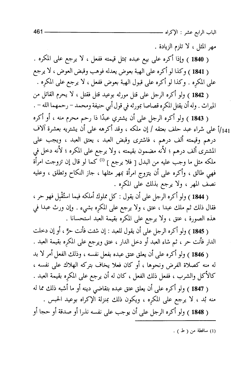 مهر المثل لا تلزم الزيادة وإذا أكره على بيع عبده بمثل قيمته ففعل لا يرجع على المكره وكذا لو أكره على الهبة بعوض يعدله فوهب وقبض العوض لا يرجع على المكره وكذا لو أكره على قبول الهبة بعوض ففعل لا يرجع على المكره ولو أكره الرجل على قتل مورثه بوعيد قتل فقتل لا يحرم القاتل من الميراث وله أن يقتل المكره قصاصا بمورثه في قول أبي حنيفة ومحمد ولو أكره الرجل على أن يشتري عبدا ذا رحم محرم منه أو أكره على شراء عبد حلف بعتقه إن ملكه وقد أكرهه على أن يشتريه بعشرة آلاف درهم وقيمته ألف درهم فاشترى وقبض العبد يعتق العبد ويجب على المشتري ألف درهم لأنه مضمون بقيمته ولا يرجع على المكره لأنه دخل في ملكه مثل ما وجب عليه من البدل كما لو قال إن تزوجت امرأة فهي طالق وأكره على أن يتزوج امرأة بمهر مثلها جاز النكاح وتطلق وعليه نصف المهر ولا يرجع بذلك على المكره ولو أكره الرجل على أن يقول كل مملوك أملكه فيما أستقبل فهو حر فقال ذلك ثم ملك عبدا عتق ولا يرجع على المكره بشيء وإن ورث عبدا في هذه الصورة عتق ولا يرجع على المكره بقيمة العبد استحسانا ولو أكره الرجل على أن يقول للعبد إن شئت فأنت حر أو إن دخلت الدار فأنت حر ثم شاء العبد أو دخل الدار عتق ويرجع على المكره بقيمة العبد ولو أكره على أن يعلق عتق عبده بفعل نفسه وذلك الفعل أمر لا بد له منه كصلاة الفرض ونحوها أو كان فعلا يخاف بتركه الهلاك على نفسه كالأكل أو الشرب ففعل ذلك الفعل كان له أن يرجع على المكره بقيمة العبد ولو أكره على أن يعلق عتق عبده بتقاضي دينه أو ما أشبه ذلك مما له منه بد لا يرجع على المكره ويكون ذلك بمنزلة الإكراه بوعيد الحبس ولو أكره الرجل على أن يوجب على نفسه نذرا أو صدقة أو حجا أو