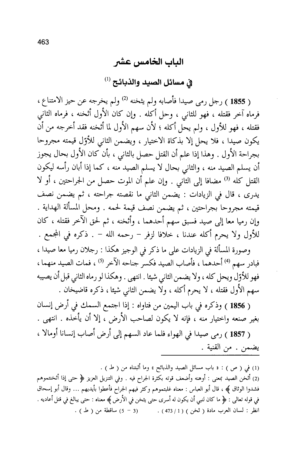 الباب الخامس عشر في مسائل الصيد والذبائح