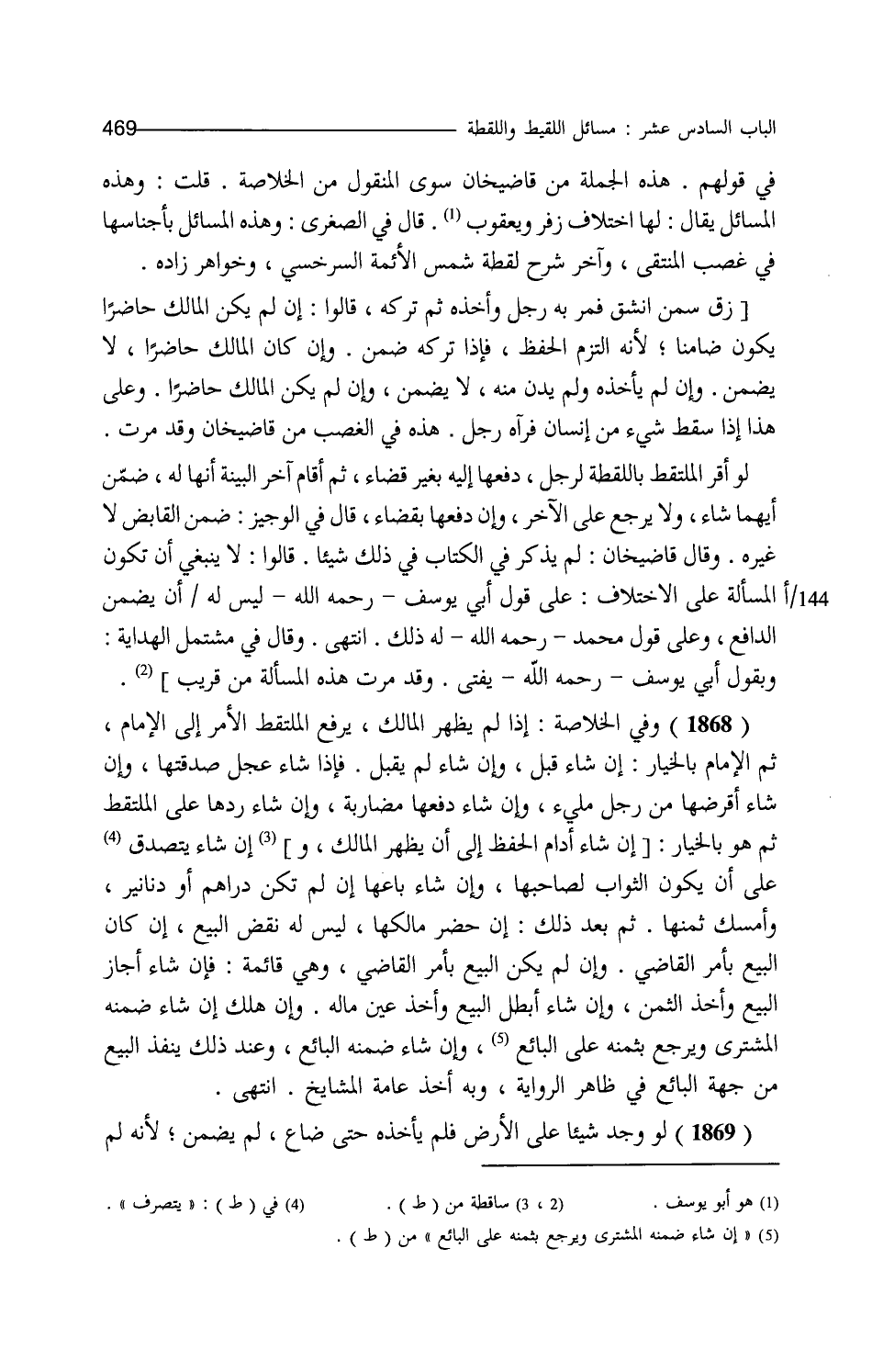 في قولهم هذه الجملة. من قاضي خان. سوى المنقول. من الخلاصة. قلت وهذه المسائل يقال لها اختلاف زفر ويعقوب قال في الصغرى وهذه المسائل بأجناسها في غصب المنتقى وآخر شرح لقطة شمس الأئمة السرخسي وخواهر زاده وفي الخلاصة إذا لم يظهر المالك يرفع الملتقط الأمر إلى الإمام ثم الإمام بالخيار إن شاء قبل وإن شاء لم يقبل فإذا قبل إن شاء عجل صدقتها وإن شاء أقرضها من رجل مليء وإن شاء دفعها مضاربة وإن شاء ردها على الملتقط ثم هو بالخيار إن شاء يتصرف على أن يكون الثواب لصاحبها وإن شاء باعها إن لم تكن دراهم أو دنانير وأمسك ثمنها ثم بعد ذلك إن حضر مالكها ليس له نقض البيع إن كان البيع بأمر القاضي وإن لم يكن البيع بأمر القاضي وهي قائمة فإن شاء أجاز البيع وأخذ الثمن وإن شاء أبطل البيع وأخذ عين ماله وإن هلك إن شاء ضمنه المشتري ويرجع بثمنه على البائع وإن شاء ضمنه البائع وعند ذلك ينفذ البيع من جهة البائع في ظاهر الرواية وبه أخذ عامة المشايخ انتهى لو وجد شيئا على الأرض فلم يأخذه حتى ضاع لم يضمن لأنه لم