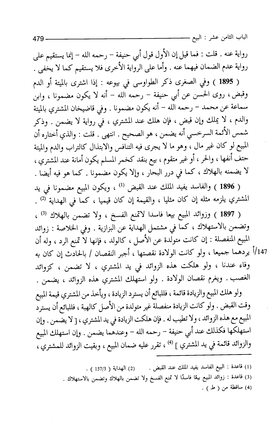 رواية عنه قلت فما قيل إن الأول قول أبي حنيفة سقط رحمه الله إنما يستقيم على رواية عدم الضمان فيهما عنه وأما على الرواية الأخرى فلا يستقيم كما لا يخفى وفي الصغرى ذكر الطواويسي في بيوعه إذا اشترى بالميتة أو الدم وقبض روى الحسن عن أبي حنيفة أنه لا يكون مضمونا وابن سماعة عن محمد أنه يكون مضمونا وفي قاضي خان المشتري بالميتة والدم لا يملك وإن قبض فإن هلك عند المشتري في رواية لا يضمن وذكر شمس الأئمة السرخسي أنه يضمن هو الصحيح انتهى قلت والذي اختاره أن المبيع لو كان غير مال وهو ما لا يجري فيه التنافس والابتذال كالتراب والدم والميتة حتف أنفها أو الحر أو غير متقوم بيع ينفذ كخمر المسلم يكون أمانة عند المشتري لا يضمنه بالهلاك كما في درر البحار وإلا يكون مضمونا كما هو فيه أيضا والفاسد يفيد الملك عند القبض ويكون المبيع مضمونا في يد المشتري يلزمه مثله إن كان مثليا والقيمة إن كان قيميا كما في الهداية وزوائد المبيع بيعا فاسدا لا تمنع الفسخ ولا تضمن بالهلاك وتضمن بالاستهلاك كما في مشتمل الهداية عن البزازية وفي الخلاصة زوائد المبيع المنفصلة إن كانت متولدة عن الأصل كالولد فإنها لا تمنع الرد وله أن يردهما جميعا ولو كانت الولادة نقصتها أجبر النقصان بالحادث إن كان به وفاء عندنا ولو هلكت هذه الزوائد في يد المشتري لا تضمن كزوائد الغصب ويغرم نقصان الولادة ولو استهلك المشتري هذه الزوائد يضمن ولو هلك المبيع والزيادة قائمة فللبائع أن يسترد الزيادة ويأخذ من المشتري قيمة المبيع وقت القبض ولو كانت الزيادة منفصلة غير متولدة من الأصل كالهبة فللبائع أن يسترد المبيع مع هذه الزوائد ولا تطيب له فإن هلكت الزيادة في يد المشتري تقرر عليه ضمان المبيع وبقيت الزوائد للمشتري