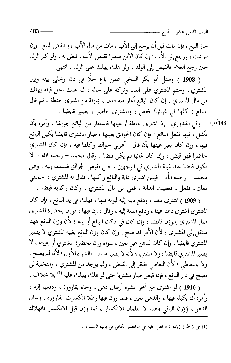 جاز البيع فإن مات قبل أن يرجع إلى الأب مات من مال الأب وانتقض البيع وإن لم يمت ورجع إلى الأب إن كان الابن صغيرا فقبض الأب قبض له ولو كبر الولد حين رجع الغلام فالقبض إلى الولد ولو هلك يهلك على الولد انتهى وسئل أبو بكر البلخي عمن باع خلا في دن وخلى بينه وبين المشتري وختم المشتري على الدن وتركه على حاله ثم هلك الخل فإنه يهلك من مال المشتري إن كان البائع أعار منه الدن بمنزلة من اشترى حنطة ثم قال للبائع كلها في غرائرك ففعل والمشتري حاضر يصير قابضا وفي القدوري إذا اشترى حنطة بعينها فاستعار من البائع جوالقا وأمره بأن يكيل فيها ففعل البائع فإن كان الجوالق بعينها صار المشتري قابضا بكيل البائع فيها وإن كان بغير عينها بأن قال أعرني جوالقا وكلها فيه فإن كان المشتري حاضرا فهو قبض وإن كان غائبا لم يكن قبضا وقال محمد لا يكون قبضا عند غيبة المشتري في الوجهين حتى يقبض الجوالق فيسلمه إليه وعن محمد فيمن اشترى دابة والبائع راكبها فقال له المشتري احملني معك ففعل فعطبت الدابة فهي من مال المشتري وكان ركوبه قبضا اشترى دهنا ودفع ديته إليه ليزنه فيها فهلك في يد البائع فإن كان المشتري اشترى دهنا عينا ودفع الدية إليه وقال زن فيها فوزن بحضرة المشتري صار المشتري بالوزن قابضا وإن كان في دكان البائع أو بيته لأن وزن البائع هاهنا منتقل إلى المشتري لأن الأمر قد صح وإن كان وزن البائع بغيبة المشتري لا يصير المشتري قابضا وإن كان الدهن غير معين سواء وزن بحضرة المشتري أو بغيبته لا يصير المشتري قابضا ولا مشتريا لأنه لا يصير مشتريا بالشراء الأول لأنه لم يصح ولا بالتعاطي لأن التعاطي يفتقر إلى القبض ولم يوجد من المشتري والتخلية لم تصح في دار البائع فإذا قبض صار مشتريا حتى لو هلك يهلك عليه نص عليه في مختصر الكافي في باب السلم بلا خلاف لو اشترى من آخره عشرة أرطال دهن وجاء بقارورة ودفعها إليه وأمره أن يكيله فيها والدهن معين فلما وزن فيها رطلا انكسرت القارورة وسال الدهن ووزن الباقي وهما لا يعلمان الانكسار فما وزن قبل الانكسار فالهلاك