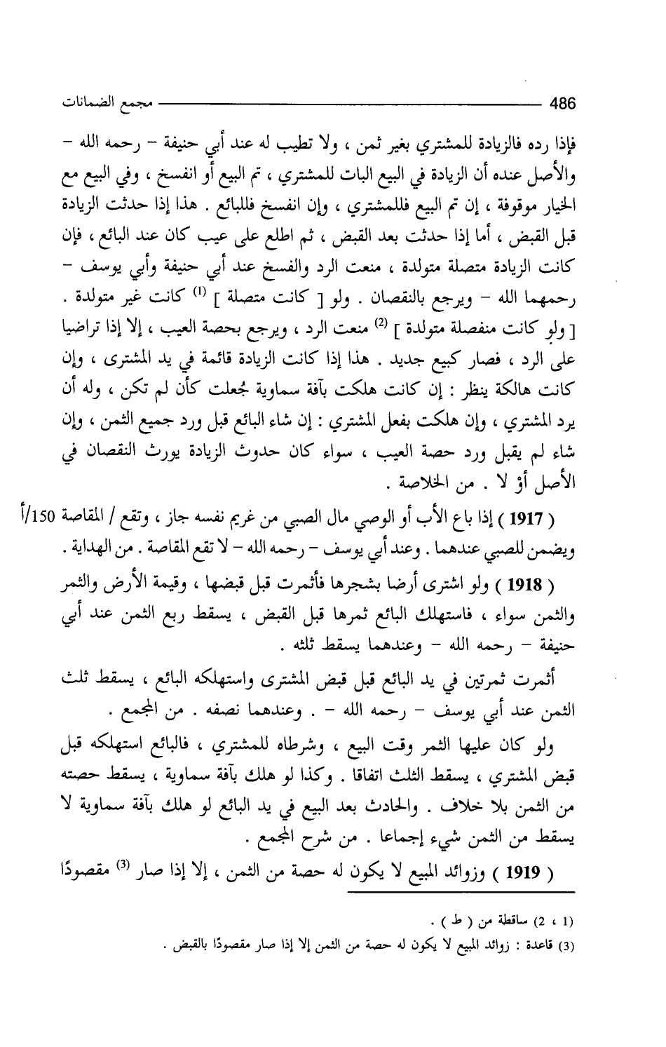 فإذا رده فالزيادة للمشتري بغير ثمن ولا تطيب له عند أبي حنيفة والأصل عنده أن الزيادة في البيع إثبات للمشتري تم البيع أو انفسخ وفي البيع مع الخيار موقوفة إن تم البيع فللمشتري وإن انفسخ فللبائع هذا إذا حدثت الزيادة قبل القبض أما إذا حدثت بعد القبض ثم اطلع على عيب كان عند البائع فإن كانت الزيادة متصلة متولدة منعت الرد والفسخ عند أبي حنيفة وأبي يوسف ويرجع بالنقصان ولو كانت غير متولدة منعت الرد ويرجع بحصة العيب إلا إذا تراضيا عن الرد فصار كبيع جديد هذا إذا كانت الزيادة قائمة في يد المشتري وإن كانت هالكة ينظر إن كانت هلكت بآفة سماوية جعلت كأن لم تكن وله أن يرد المشترى وإن هلكت بفعل المشتري إن شاء البائع قبل ورد جميع الثمن وإن شاء لم يقبل ورد حصة العيب سواء كان حدوث الزيادة يورث النقصان في الأصل أولا. من الخلاصة. إذا باع الأب أو الوصي مال الصبي من غريم نفسه جاز وتقع المقاصة ويضمن للصبي عندهما وعند أبي يوسف لا تقع المقاصة. من الهداية. ولو اشترى أرضا بشجرها فأثمرت قبل قبضها وقيمة الأرض والثمر والثمن سواء فاستهلك البائع ثمرها قبل القبض يسقط ربع الثمن عند أبي حنيفة وعندهما يسقط ثلثه أثمرت ثمرتين في يد البائع قبل قبض المشتري واستهلكه البائع يسقط ثلث الثمن عند أبي يوسف وعندهما نصفه من المجمع ولو كان عليها الثمر وقت البيع وشرطاه للمشتري فالبائع استهلكه قبل قبض المشتري يسقط الثلث اتفاقا وكذا لو هلك بآفة سماوية يسقط حصته من الثمن بلا خلاف والحادث بعد البيع في يد البائع لو هلك بآفة سماوية لا يسقط من الثمن شيء إجماعا من شرح المجمع وزوائد المبيع لا يكون له حصة من الثمن إلا إذا صار مقصودا