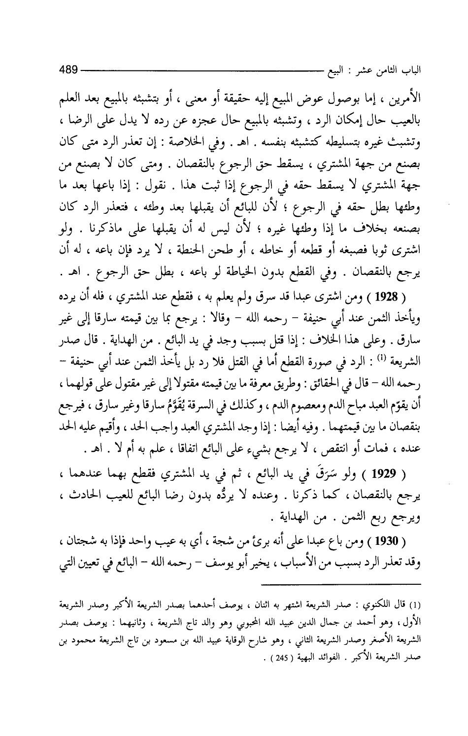 الأمرين إما بوصول عوض المبيع إليه حقيقة أو معنى أو بتشبثه بالمبيع بعد العلم بالعيب حال إمكان الرد وتشبثه بالمبيع حال عجزه عن رده لا يدل على الرضا وتشبث غيره بتسليطه كتشبثه بنفسه ا هـ وفي الخلاصة إن تعذر الرد متى كان يصنع من جهة المشتري يسقط حق الرجوع بالنقصان ومتى كان لا يصنع من جهة المشتري لا يسقط حقه في الرجوع إذا ثبت هذا نقول إذا باعها بعدما وطئها بطل حقه في الرجوع لأن للبائع أن يقبلها بعد وطئه فتعذر الرد كان بصنعه بخلاف ما إذا وطئها غيره لأنه ليس له أن يقبلها على ما ذكرنا ولو اشترى ثوبا فصبغه أو قطعه أو خاطه أو طحن الحنطة لا يرد فإن باعه له أن يرجع بالنقصان وفي القطع بدون الخياطة لو باعه بطل حق الرجوع ا هـ ومن اشترى عبدا قد سرق ولم يعلم به فقطع عند المشتري فله أن يرده ويأخذ الثمن عند أبي حنيفة وقالا يرجع بما بين قيمته سارقا إلى غير سارق وعلى هذا الخلاف إذا قتل بسبب وجد في يد البائع. من الهداية. قال صدر الشريعة الرد في صورة القطع أما في القتل فلا رد بل يأخذ الثمن عند أبي حنيفة قال في الحقائق وطريق معرفة ما بين قيمته مقتولا إلى غير مقتول على قولهما أن يقوم العبد مباح الدم ومعصوم الدم وكذلك في السرقة يقوم سارقا وغير سارق فيرجع بنقصان ما بين قيمتهما وفيه أيضا إذا وجد المشتري العبد واجب الحد وأقيم عليه الحد عنده فمات أو انتقص لا يرجع بشيء على البائع اتفاقا علم به أم لا ا هـ ولو سرق في يد البائع ثم في يد المشتري فقطع بهما عندهما يرجع بالنقصان كما ذكرنا وعنده لا يرده بدون رضا البائع للعيب الحادث ويرجع بربع الثمن. من الهداية. ومن باع عبدا على أنه بريء من شجة أي به عيب واحد فإذا به شجتان وقد تعذر الرد بسبب من الأسباب يخير أبو يوسف البائع في تعيين التي