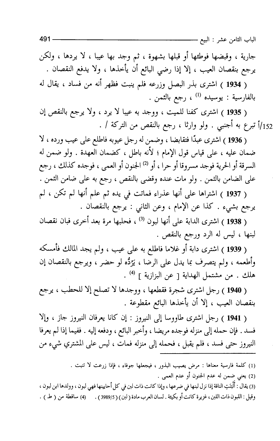 جارية وقبضها فوطئها أو قبلها بشهوة ثم وجد بها عيبا لا يردها ولكن يرجع بنقصان العيب إلا إذا رضي البائع أن يأخذها ولا يدفع النقصان اشترى بذر البصل وزرعه فلم ينبت فظهر أنه من فساد يقال له بالفارسية يو سيده رجع بالثمن اشترى كفنا للميت ووجد به عيبا لا يرد ولا يرجع بالنقص إن تبرع به أجنبي ولو وارثا رجع بالنقص من التركة اشترى عبدا فتقابضا وضمن له رجل عيوبه فاطلع على عيب ورده لا ضمان عليه على قياس قول الإمام لأنه باطل كضمان العهد ولو ضمن له السرقة أو الحرية فوجد مسروقا أو حرا أو الجنون أو العمى فوجده كذلك رجع على الضامن بالثمن ولو مات عنده وقضى بالنقص رجع به على ضامن الثمن اشتراها على أنها عذراء فماتت في يده ثم علم أنها لم تكن لم يرجع بشيء كذا عن الإمام وعن الثاني يرجع بالنقصان اشترى الدابة على أنها لبون فحلبها مرة بعد أخرى فبان نقصان لبنها ليس له الرد ورجع بالنقص اشترى دابة أو غلاما فاطلع به على عيب ولم يجد المالك فأمسكه وأطعمه ولم يتصرف بما يدل على الرضا يرده لو حضر ويرجع بالنقصان إن هلك من مشتمل الهداية رجل اشترى شجرة فقطعها ووجدها لا تصلح إلا للحطب يرجع بنقصان العيب إلا أن يأخذها البائع مقطوعة رجل اشترى طاوسا إلى النيروز إن كانا يعرفان النيروز جاز وإلا فسد فإن حمله إلى منزله فوجده مريضا وأخبر البائع ودفعه إليه ففيما إذا لم يعرفا النيروز حتى فسد فلم يقبل فحمله إلى منزله فمات ليس على المشتري شيء من