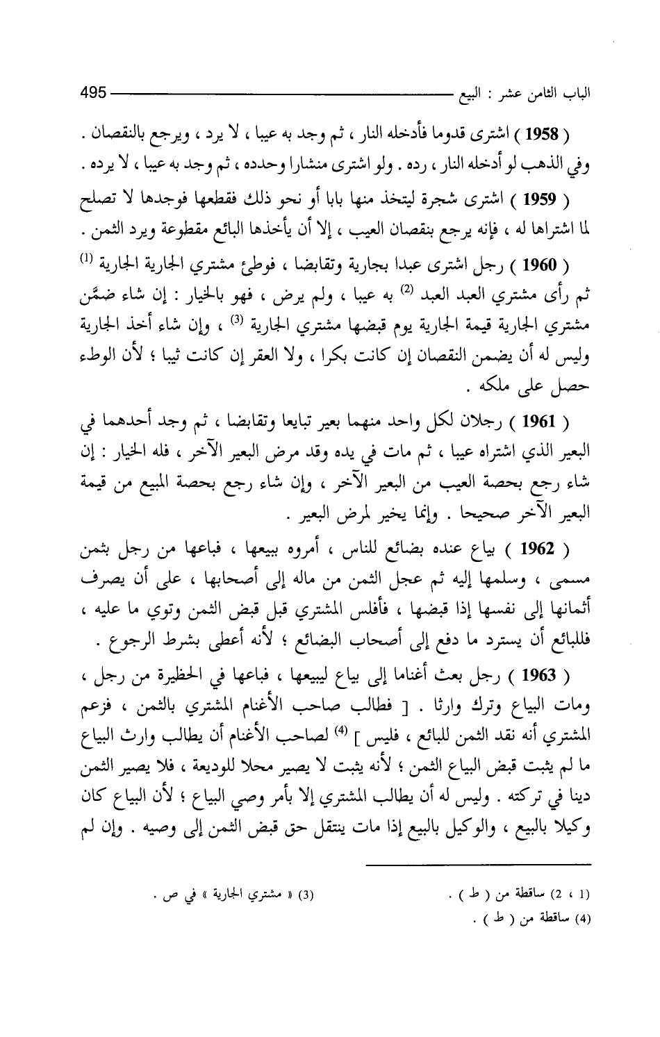 اشترى قدوما فأدخله النار ثم وجد به عيبا لا يرد ويرجع بالنقصان وفي الذهب لو أدخله النار رده ولو اشترى منشارا وحدده ثم وجد به عيبا لا يرده اشترى شجرة ليتخذ منها بابا أو نحو ذلك فقطعها فوجدها لا تصلح لما اشتراها له فإنه يرجع بنقصان العيب إلا أن يأخذها البائع مقطوعة ويرد الثمن رجل اشترى عبدا بجارية وتقابضا فوطئ المشتري الجارية ثم رأى مشتري العبد به عيبا ولم يرض فهو بالخيار إن شاء ضمن مشتري الجارية قيمة الجارية يوم قبضها وإن شاء أخذ الجارية وليس له أن يضمن النقصان إن كانت بكرا ولا العقر إن كانت ثيبا لأن الوطء حصل على ملكه رجلان لكل واحد منهما بعير تبايعا وتقابضا ثم وجد أحدهما في البعير الذي اشتراه عيبا ثم مات في يده وقد مرض البعير الآخر فله الخيار إن شاء رجع بحصة العيب من البعير الآخر وإن شاء رجع بحصة المبيع من قيمة البعير الآخر صحيحا وإنما يخير لمرض البعير بياع عنده بضائع للناس أمروه ببيعها فباعها من رجل بثمن مسمى وسلمها إليه ثم عجل الثمن من ماله إلى أصحابها على أن يصرف أثمانها إلى نفسها إذا قبضها فأفلس المشتري قبل قبض الثمن ونوى ما عليه فللبائع أن يسترد ما دفع إلى أصحاب البضائع لأنه أعطى بشرط الرجوع رجل بعث أغناما إلى بياع ليبيعها فباعها في الحظيرة من رجل ومات البياع وترك وارثا فلصاحب الأغنام أن يطالب وارث البياع ما لم يثبت قبض البياع الثمن لأنه ما لم يثبت لا يصير محلا للوديعة فلا يصير الثمن دينا في تركته وليس له أن يطالب المشتري إلا بأمر وصي البياع لأن البياع كان وكيلا بالبيع والوكيل بالبيع إذا مات ينتقل حق قبض الثمن إلى وصيه وإن لم