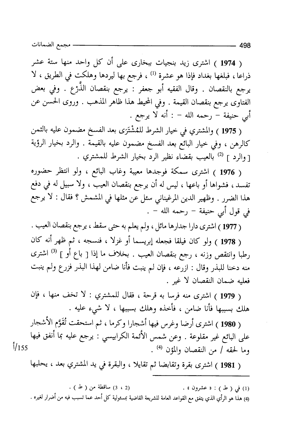 اشترى زيد بنجيات ببخارى على أن كل واحد منها ستة عشر ذراعا فبلغها بغداد فإذا هو عشرون فرجع بها ليردها وهلكت في الطريق لا يرجع بالنقصان وقال الفقيه أبو جعفر يرجع بنقصان الذرع وفي بعض الفتاوى يرجع بنقصان القيمة وفي المحيط هذا ظاهر المذهب وروى الحسن عن أبي حنيفة أنه لا يرجع والمشتري في خيار الشرط للمشتري بعد الفسخ مضمون عليه بالثمن كالرهن وفي خيار البائع بعد الفسخ مضمون عليه بالقيمة والرد بخيار الرؤية والعيب بقضاء نظير الرد بخيار الشرط للمشتري اشترى سمكة فوجدها معيبة وغاب البائع ولو انتظر حضوره تفسد فشواها أو باعها ليس له أن يرجع بنقصان العيب ولا سبيل له في دفع هذا الضرر وظهير الدين المرغيناني سئل عن مثلها في المشمش فقال لا يرجع في قول أبي حنيفة اشترى دارا جدارها مائل ولم يعلم به حتى سقط يرجع بنقصان العيب ولو كان فيلقا فجعله إبريسما أو غزلا فنسجه ثم ظهر أنه كان رطبا وانتقص وزنه رجع بنقصان العيب بخلاف ما إذا اشترى منه دخنا للبذر وقال ازرعه فإن لم ينبت فأنا ضامن لهذا البذر فزرع ولم ينبت فعليه ضمان النقصان لا غير اشترى منه فرسا به قرحة فقال للمشتري لا تخف منها فإن هلك بسببها فأنا ضامن فأخذه وهلك بسببها لا شيء عليه اشترى أرضا وغرس فيها أشجارا وكرما ثم استحقت تقوم الأشجار على البائع غير مقلوعة وعن شمس الأئمة الكرابيسي يرجع عليه بما أنفق فيها وما لحقه من النقصان والمؤن اشترى بقرة وتقابضا ثم تقايلا والبقرة في يد المشتري بعد يحلبها