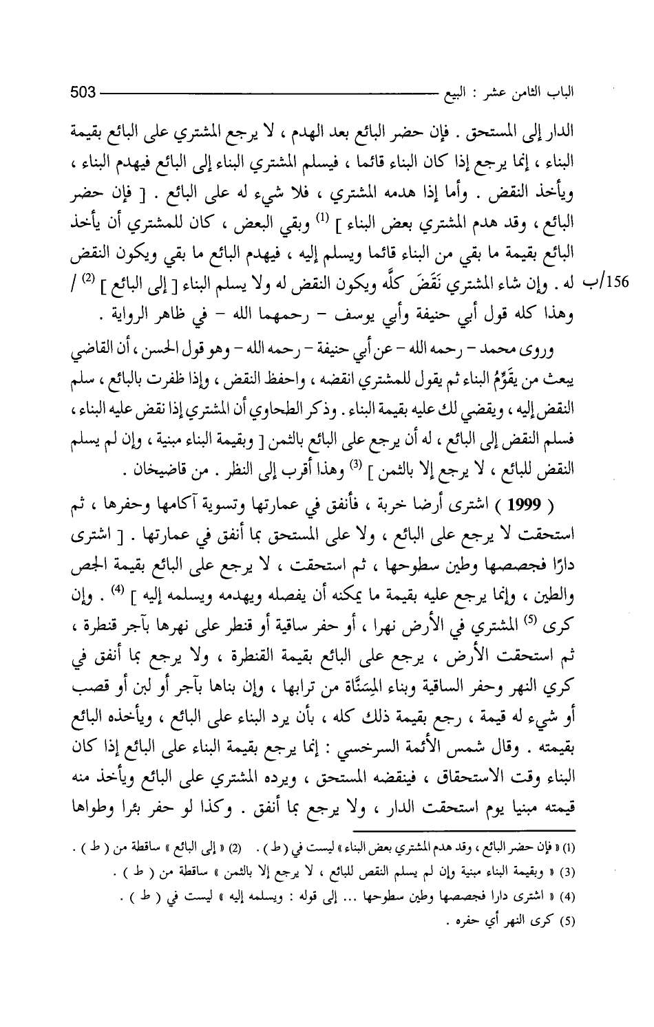 الدار إلى المستحق فإن حضر البائع بعد الهدم لا يرجع المشتري على البائع بقيمة البناء إنما يرجع إذا كان البناء قائما فيسلم المشتري البناء إلى البائع فيهدم البناء ويأخذ النقض وأما إذا هدمه المشتري فلا شيء له على البائع وأما إذا هدمه وبقي البعض كان للمشتري أن يأخذ البائع بقيمة ما بقي من البناء قائما ويسلم إليه فيهدم البائع ما بقي ويكون النقض له وإن شاء المشتري نقض كله ويكون النقض له ولا يسلم البناء وهذا كله قول أبي حنيفة وأبي يوسف في ظاهر الرواية وروى محمد عن أبي حنيفة وهو قول الحسن أن القاضي يبعث من يقوم البناء ثم يقول للمشتري انقضه واحفظ النقض وإذا ظفر بالبائع سلم النقض إليه ويقضى لك عليه بقيمة البناء وذكر الطحاوي إن المشتري إذا نقض عليه البناء فسلم النقض إلى البائع له أن يرجع على البائع بالثمن وهذا أقرب إلى النظر. من قاضي خان. اشترى أرضا خربة فأنفق في عمارتها وتسوية آكامها وحفرها ثم استحقت لا يرجع على البائع ولا على المستحق بما أنفق في عمارتها وإن كرى المشتري في الأرض نهرا أو حفر ساقية أو قنطرة على نهرها بآجر قنطرة ثم استحقت الأرض يرجع على البائع بقيمة القنطرة ولا يرجع بما أنفق في كري النهر وحفر الساقية وبناء المسناة من ترابها وإن بناها بآجر أو لبن أو قصب أو شيء له قيمة رجع بقيمة ذلك كله بأن يرد البناء على البائع ويأخذ البائع بقيمته وقال شمس الأئمة السرخسي إنما يرجع بقيمة البناء على البائع إذا كان البناء وقت الاستحقاق فينقضه المستحق ويرده المشتري على البائع ويأخذ منه قيمته مبنيا يوم استحقت الدار ولا يرجع بما أنفق وكذا لو حفر بئرا وطواها