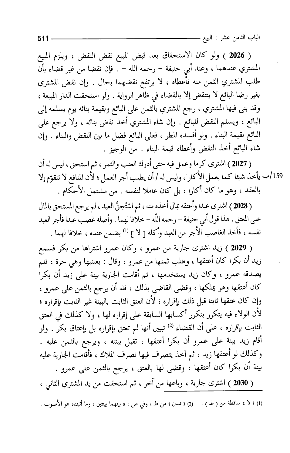 ولو كان الاستحقاق بعد قبض المبيع نقض النقض ويلزم المبيع المشتري عندهما وعند أبي حنيفة فإن نقضا من غير قضاء بأن طلب المشتري الثمن منه فأعطاه لا يرتفع نقضهما بحال وإن نقض المشتري بغير رضا البائع لا ينتقض إلا بالقضاء في ظاهر الرواية ولو استحقت الدار المبيعة وقد بنى فيها المشتري رجع المشتري بالثمن على البائع وبقيمة بنائه يوم يسلمه إلى البائع ويسلم النقص للبائع وإن شاء المشتري أخذ نقض بنائه ولا يرجع على البائع بقيمة البناء ولو أفسده المطر فعلى البائع فضل ما بين النقض والبناء وإن شاء البالغ أخذ النقض وأعطاه قيمة البناء. من الوجيز. اشترى كرما وعمل فيه حتى أدرك العنب والثمر ثم استحق ليس له أن يأخذ شيئا كما يعمل الأكار وليس له أن يطلب أجر العمل لأن المنافع لا تتقوم إلا بالعقد وهو ما كان أكارا بل كان عاملا لنفسه من مشتمل الأحكام اشترى عبدا وأعتقه بمال أخذه منه ثم استحق العبد لم يرجع المستحق بالمال على المعتق هذا قول أبي حنيفة رحمه الله خلافا لهما وأصله غصب عبدا فأجر العبد نفسه فأخذ الغاصب الأجر من العبد وأكله يضمن عنده خلافا لهما زيد اشترى جارية من عمرو وكان عمرو اشتراها من بكر فسمع زيد أن بكرا كان أعتقها وطلب ثمنها من عمرو وقال بعتنيها وهي حرة فلم يصدقه عمرو وكان زيد يستخدمها ثم أقامت الجارية بينة على زيد أن بكرا كان أعتقها وهو يملكها وقضى القاضي بذلك فله أن يرجع بالثمن على عمرو وإن كان عتقها ثابتا قبل ذلك بإقراره لأن العتق الثابت بالبينة غير الثابت بإقراره لأن الولاء فيه يتكرر بتكرر أكسابها السابقة على إقراره لها ولا كذلك في العتق الثابت بإقراره على أن القضاء تبيين أنها لم تعتق بإقراره بل بإعتاق بكر ولو أقام زيد بينة على عمرو أن بكرا أعتقها تقبل بينته ويرجع بالثمن عليه وكذلك لو أعتقها زيد ثم أخذ يتصرف فيها تصرف الملاك فأقامت الجارية عليه بينة أن بكرا كان أعتقها وقضى لها بالعتق يرجع بالثمن على عمرو اشترى جارية وباعها من آخر ثم استحقت من يد المشتري الثاني