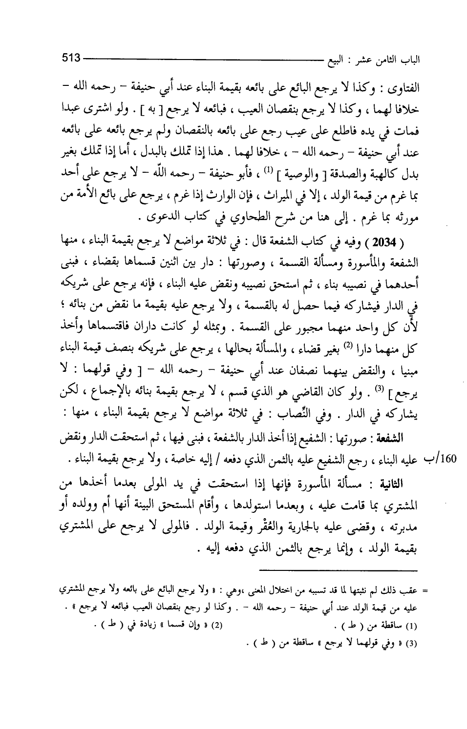 وفي الفتاوى وكذا لا يرجع البائع على بائعه بقيمة عند البناء أبي حنيفة خلافا لهما وكذا لا يرجع بنقصان العيب فبائعه لا يرجع ولو اشترى عبدا فمات في يده فاطلع على عيب رجع على بائعه بالنقصان ولم يرجع بائعه على بائعه عند أبي حنيفة خلافا لهما هذا إذا تملك بالبدل أما إذا تملك بغير بدل كالهبة والصدقة فأبو حنيفة لا يرجع على أحد بما غرم من قيمة الولد إلا في الميراث فإن الوارث إذا غرم يرجع على بائع الأمة من مورثه بما غرم إلى هنا من شرح الطحاوي في كتاب الدعوى وفيه في كتاب الشفعة قال في ثلاثة مواضع لا يرجع بقيمة البناء منها الشفعة والمأسورة ومسألة القسمة وصورتها دار بين اثنين قسماها بقضاء فبنى أحدهما في نصيبه بناء ثم استحق نصيبه ونقض عليه البناء فإنه يرجع على شريكه في الدار فيشاركه فيما حصل له بالقسمة ولا يرجع عليه بقيمة ما نقض من بنائه لأن كل واحد منهما مجبور على القسمة وبمثله لو كانت داران فاقتسماها وأخذ كل منهما دارا وإن قسما بغير قضاء والمسألة بحالها يرجع على شريكه بنصف قيمة البناء مبنيا والنقض بينهما نصفان عند أبي حنيفة ولو كان القاضي هو الذي قسم لا يرجع بقيمة بنائه بالإجماع لكن يشاركه في الدار وفي النصاب في ثلاث مواضع لا يرجع بقيمة البناء منها الشفعة صورتها الشفيع إذا أخذ الدار بالشفعة فبنى فيها ثم استحقت الدار ونقض عليه البناء رجع الشفيع عليه بالثمن الذي دفعه إليه خاصة ولا يرجع بقيمة البناء الثانية مسألة المأسورة فإنها إذا استحقت في يد المولى بعدما أخذها من المشتري بما قامت عليه وبعدما استولدها وأقام المستحق البينة أنها أم ولده أو مدبرته وقضى عليه بالجارية والعقر وقيمة الولد فالمولى لا يرجع على المشتري بقيمة الولد وإنما يرجع بالثمن الذي دفع إليه