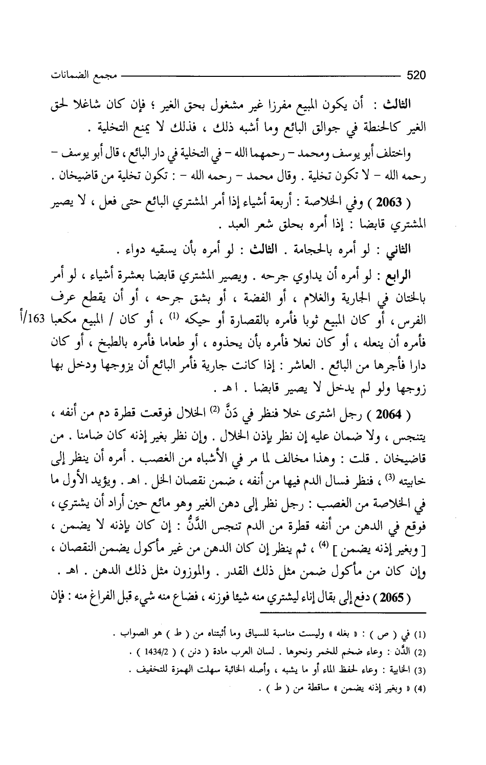 الثالث أن يكون المبيع مفرزا غير مشغول بحق الغير فإن كان شاغلا لحق الغير كالحنطة في جوالق البائع وما أشبه ذلك فذلك لا يمنع التخلية واختلف أبو يوسف ومحمد في التخلية في دار البائع قال أبو يوسف لا تكون تخلية وقال محمد تكون تخلية. من قاضي خان. وفي الخلاصة أربعة أشياء إذا أمر المشتري البائع حتى فعل لا يصير المشتري قابضا إذا أمره بحلق شعر العبد الثاني لو أمره بالحجامة الثالث لو أمره بأن يسقيه دواء الرابع لو أمره أن يداوي جرحه ويصير المشتري قابضا بعشرة أشياء لو أمره بالختان في الجارية والغلام أو الفضة أو بشق جرحه أو أن يقطع عرف الفرس أو كان المبيع ثوبا فأمره بالقصارة أو حبكه أو كان المبيع مكعبا فأمره أن ينعله أو كان نعلا فأمره بأن يحذوه أو طعاما فأمره بالطبخ أو كان دارا فأجرها من البائع العاشر إذا كانت جارية فأمر البائع أن يزوجها ودخل بها زوجها ولو لم يدخل لا يصير قابضا ا هـ رجل اشترى خلا فنظر في دن الخلال فوقعت قطرة دم من أنفه يتنجس ولا ضمان عليه إن نظر بإذن الخلال وإن نظر بغير إذنه كان ضامنا. من قاضي خان. قلت وهذا مخالف لما مر في الأشباه من الغصب أمره أن ينظر إلى خابيته فنظر فسال الدم فيها من أنفه ضمن نقصان الخل ا هـ ويؤيد الأول ما في الخلاصة من الغصب رجل نظر إلى دهن الغير وهو مائع حين أراد أن يشتري فوقع في الدهن من أنفه قطرة من الدم تنجس الدن وإن كان بإذنه لا يضمن ثم ينظر إن كان الدهن من غير مأكول يضمن النقصان وإن كان من مأكول ضمن مثل ذلك القدر والموزون مثل ذلك الدهن ا هـ دفع إلى بقال إناء ليشتري منه شيئا فوزنه فضاع منه شيء قبل الفراغ منه فإن