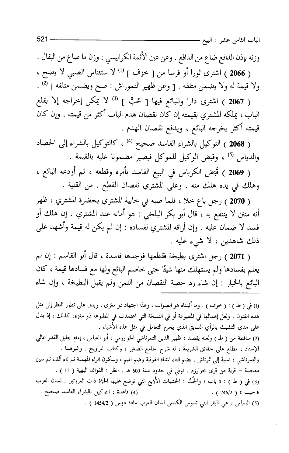 وزنه بإذن الدافع ضاع من الدافع وعن عين الأئمة الكرابيسي وزن ما ضاع من البقال اشترى ثورا أو فرسا من خوف لاستئناس الصبي لا يصح ولا قيمة له ولا يضمن متلفه اشترى دارا وللبائع فيها باب لا يمكن إخراجه إلا بقلع الباب يملكه المشتري بقيمته إن كان نقصان هدم الباب أكثر من قيمته وإن كان قيمته أكثر يخرجه البائع ويدفع نقصان الهدم التوكيل بالشراء الفاسد صحيح كالتوكيل بالشراء إلى الحصاد والدياس وقبض الوكيل للموكل فيصير مضمونا عليه بالقيمة قبض الكرباس في البيع الفاسد بأمره وقطعه ثم أودعه البائع وهلك في يده هلك منه وعلى المشتري نقصان القطع. من القنية. رجل باع خلا فلما صبه في خابية المشتري بحضرة المشتري ظهر أنه منتن لا ينتفع به قال أبو بكر البلخي هو أمانة عند المشتري إن هلك أو فسد لا ضمان عليه وإن أراقه المشتري لفساده إن لم يكن له قيمة وأشهد على ذلك شاهدين لا شيء عليه رجل اشترى بطيخة فقطعها فوجدها فاسدة قال أبو القاسم إن لم يعلم بفسادها ولم يستهلك منها شيئا حتى خاصم البائع ولها مع فسادها قيمة كان البائع بالخيار إن شاء رد حصة النقصان من الثمن ولم يقبل البطيخة وإن شاء