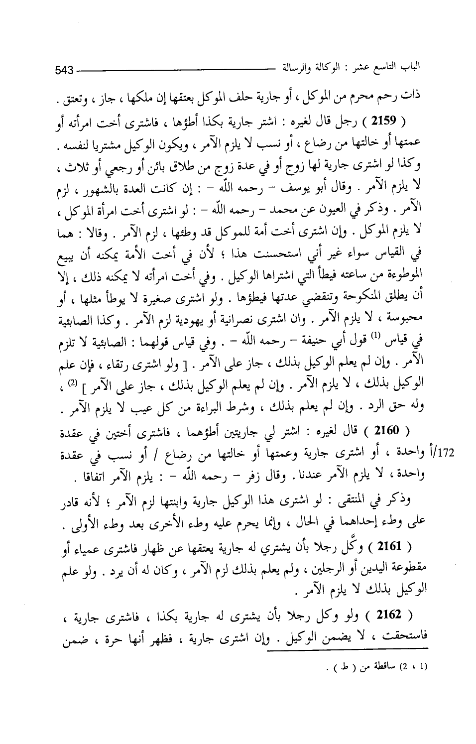 ذات رحم محرم من الموكل أو جارية حلف الموكل بعتقها إن ملكها جاز وتعتق رجل قال لغيره اشتر جارية بكذا أطؤها فاشترى أخت امرأته أو عمتها أو خالتها من رضاع أو نسب لا يلزم الآمر ويكون الوكيل مشتريا لنفسه وكذا لو اشترى جارية لها زوج أو في عدة زوج من طلاق بائن أو رجعي أو ثلاث لا يلزم الآمر وقال أبو يوسف إن كانت العدة بالشهور لزم الآمر وذكر في العيون عن محمد لو اشترى أخت امرأة الموكل لا يلزم الموكل وإن اشترى أخت أمة للموكل قد وطئها لزم الآمر وقالا هما في القياس سواء غير أني استحسنت هذا لأن في أخت الأمة يمكنه أن يبيع الموطوءة من ساعته فيطأ التي اشتراها الوكيل وفي أخت امرأته لا يمكنه ذلك إلا أن يطلق المنكوحة وتنقضي عدتها فيطؤها ولو اشترى صغيرة لا يوطأ مثلها أو محبوسة لا يلزم الآمر وإن اشترى نصرانية أو يهودية لزم الآمر وكذا الصابئية في قول أبي حنيفة وفي قياس قولهما الصابئية لا تلزم الآمر وإن لم يعلم الوكيل بذلك جاز على الآمر وله حق الرد وإن لم يعلم بذلك وشرط البراءة من كل عيب لا يلزم الآمر قال لغيره اشتر لي جاريتين أطؤهما فاشترى أختين في عقد واحد أو اشترى جارية وعمتها أو خالتها من رضاع أو نسب في عقدة واحدة لا يلزم الآمر عندنا وقال زفر يلزم الآمر اتفاقا وذكر في المنتقى لو اشترى هذا الوكيل جارية وابنتها لزم الآمر لأنه قادر على وطء إحداهما في الحال وإنما يحرم عليه وطء الأخرى بعد وطء الأولى وكل رجلا بأن يشتري له جارية يعتقها عن ظهار فاشترى عمياء أو مقطوعة اليدين أو الرجلين ولم يعلم بذلك لزم الآمر وكان له أن يرد ولو علم الوكيل بذلك لا يلزم الآمر ولو وكل رجلا بأن يشتري له جارية بكذا فاشترى جارية فاستحقت لا يضمن الوكيل وإن اشترى جارية فظهر أنها حرة ضمن