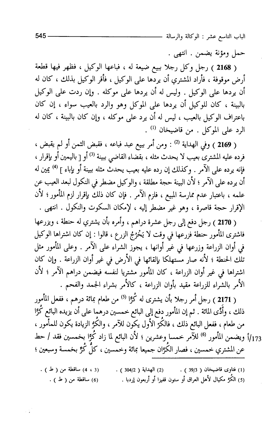 حمل ومؤنة يضمن انتهى رجل وكل رجلا ببيع ضيعة له فباعها الوكيل فظهر فيها قطعة أرض موقوفة فأراد المشتري أن يردها على الوكيل فأقر الوكيل بذلك كان له أن يردها على الوكيل وليس له أن يردها على موكله وإن ردت على الوكيل بالبينة كان للوكيل أن يردها على الموكل وهو والرد بالعيب سواء إن كان باعتراف الوكيل بالعيب ليس له أن يرد على موكله وإن كان بالبينة كان له الرد على الموكل. من قاضي خان. وفي الهداية ومن أمر ببيع عبد فباعه فقبض الثمن أو لم يقبض فرده عليه المشتري بعيب لا يحدث مثله بقضاء القاضي أو بإباء يمين له أن يرده على الآمر لأن البينة حجة مطلقة والوكيل مضطر في النكول لبعد العيب عن عمله باعتبار عدم ممارسة المبيع فلزم الآمر فإن كان ذلك بإقرار لزم المأمور لأن الإقرار حجة قاصرة وهو غير مضطر إليه لإمكان السكوت والنكول انتهى رجل دفع إلى رجل عشرة دراهم وأمره بأن يشتري له حنطة ويزرعها فاشترى المأمور حنطة فزرعها في وقت لا يخرج الزرع قالوا إن كان اشتراها الوكيل في أوان الزراعة وزرعها في غير أوانها يجوز الشراء على الآمر وعلى المأمور مثل تلك الحنطة لأنه صار مستهلكا بإلقائها في الأرض في غير أوان الزراعة وإن كان اشتراها في غير أوان الزراعة كان المأمور مشتريا لنفسه فيضمن دراهم الآمر لأن الأمر بالشراء للزراعة مقيد بأوان الزراعة كالأمر بشراء الجمد والفحم رجل أمر رجلا بأن يشتري له كرا من طعام بمائة درهم ففعل المأمور ذلك وأدى المائة ثم إن المأمور دفع إلى البائع خمسين درهما على أن يزيده البائع كرا من طعام ففعل البائع ذلك فالكر الأول يكون للآمر والكر الزيادة يكون للمأمور ويضمن للآمر خمسا وعشرين لأن البائع لما زاد كرا بخمسين فقد حط عن المشتري خمسين فصار الكران جميعا بمائة وخمسين كل كر بخمسة وسبعين
