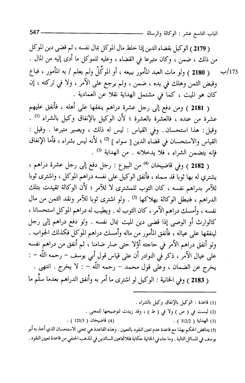 الوكيل بقضاء الدين إذا صرف مال الموكل في حاجة نفسه ثم قضى دين الموكل يكون متبرعا في قضاء دين الموكل من الخانية الوكيل بالبيع إذا أمهل المشتري صح إمهاله وكان للموكل أن يطالب الوكيل في الحال فيؤدي من مال نفسه ثم عند محل الأجل يأخذ من المشتري لنفسه الوكيل بقضاء الدين إذا خلط مال الموكل بمال نفسه ثم قضى دين الموكل من ذلك ضمن وكان متبرعا في القضاء وعليه للموكل ما أدى إليه من المال ولو مات العبد المأمور ببيعه أو الموكل ولم يعلم به المأمور فباع وقبض الثمن وهلك في يده ضمن ولم يرجع على الآمر ولا في تركته إن كان هو الميت كما في مشتمل الهداية نقلا عن العمادية ومن دفع إلى رجل عشرة دراهم ينفقها على أهله فأنفق عليهم عشرة من عنده فالعشرة بالعشرة لأن الوكيل بالإنفاق وكيل بالشراء وقيل هذا استحسان وفي القياس ليس له ذلك ويصير متبرعا وقيل القياس والاستحسان في قضاء الدين لأنه ليس بشراء فأما الإنفاق فإنه يتضمن الشراء فلا يدخلانه. من الهداية. وفي قاضي خان من البيوع رجل دفع إلى رجل عشرة دراهم يشتري له بها ثوبا قد سماه فأنفق الوكيل على نفسه دراهم الموكل واشترى ثوبا للآمر بدراهم نفسه كان الثوب للمشتري لا للآمر لأن الوكالة تقيدت بتلك الدراهم فتبطل الوكالة بهلاكها ولو اشترى ثوبا للآمر ونقد الثمن من مال نفسه وأمسك دراهم الآمر كان الثوب له ويطيب له دراهم الموكل استحسانا كالوارث أو الوصي إذا قضى دين الميت بمال نفسه ولو دفع دراهم إلى رجل لينفقها على عياله فأنفق المأمور من ماله وأمسك دراهم الموكل فكذلك الجواب ولو أنفق دراهم الآمر في حاجته أولا حتى صار ضامنا ثم أنفق من دراهم نفسه على عيال الآمر ذكر في النوادر أن على قياس قول أبي يوسف يخرج عن الضمان وعلى قول محمد لا يخرج انتهى وفي الخانية الوكيل إذا اشترى ما أمر به وأنفق الدراهم بعدما سلم ما