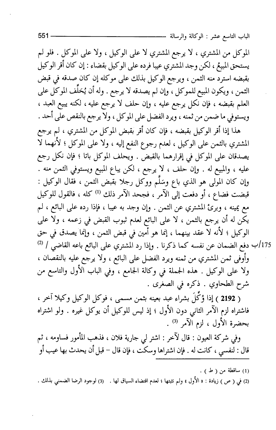 الموكل من المشتري لا يرجع المشتري لا على الوكيل ولا على الموكل فلو لم يستحق المبيع لكن وجد المشتري عيبا فرده على الوكيل بقضاء إن كان أقر الوكيل بقبضه استرد منه الثمن ويرجع الوكيل بذلك على موكله إن كان صدقه في قبض الثمن ويكون المبيع للموكل وإن لم يصدقه لا يرجع وله أن يحلف الموكل على العلم بقبضه فإن نكل يرجع عليه وإن حلف لا يرجع عليه لكنه يبيع العبد ويستوفي ما ضمن من ثمنه ويرد الفضل على الموكل ولا يرجع بالنقض على أحد هذا إذا أقر الوكيل بقبضه فإن كان أقر بقبض الموكل من المشتري لم يرجع المشتري بالثمن على الوكيل لعدم رجوع النفع إليه ولا على الموكل لأنهما لا يصدقان على الموكل في إقرارهما بالقبض ويحلف الموكل باتا فإن نكل رجع عليه والمبيع له وإن حلف لا يرجع لكن يباع المبيع يستوفي الثمن منه وإن كان المولى هو الذي باع وسلم ووكل رجلا بقبض الثمن فقال الوكيل قبضت فضاع أو دفعت إلى الآمر فجحد الآمر كله فالقول للوكيل مع يمينه وبرئ المشتري عن الثمن وإن وجد به عيبا فإذا رده على البائع لم يكن له أن يرجع بالثمن لا على البائع لعدم ثبوت القبض في زعمه ولا على الوكيل لأنه لا عقد بينهما إنما هو أمين في قبض الثمن وإنما يصدق في حق دفع الضمان عن نفسه كما ذكرنا وإذا رد المشتري على البائع باعه القاضي وأوفى ثمن المشتري من ثمنه ويرد الفضل على البائع ولا يرجع عليه بالنقصان ولا على الوكيل هذه الجملة في وكالة الجامع وفي الباب الأول والتاسع من شرح الطحاوي ذكره في الصغرى وإذا وكل بشراء عبد بعينه بثمن مسمى فوكل الوكيل وكيلا آخر فاشتراه لزم الآمر الثاني دون الأول إذا ليس للوكيل أن يوكل غيره ولو اشتراه بحضرة الأول لزم الآمر وفي شركة العيون قال الآخر اشتر لي جارية فلان فذهب المأمور فساومها ثم قال لنفسي كانت له فإن اشتراها وسكت فإن قال قبل أن يحدث بها عيب أو
