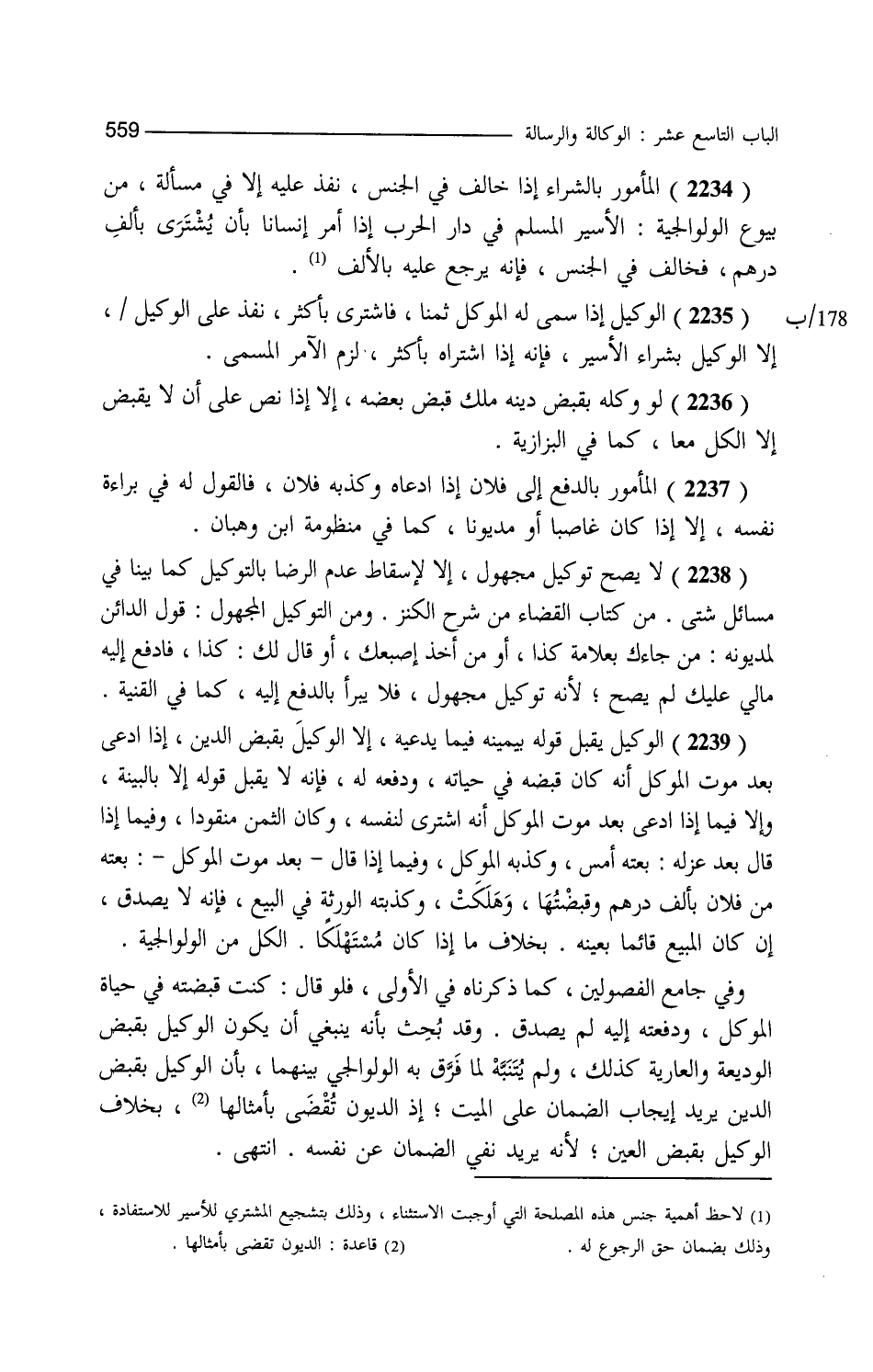 المأمور بالشراء إذا خالف في الجنس نفذ عليه إلا في مسألة من بيوع الولوالجية الأسير المسلم في دار الحرب إذا أمر إنسانا بأن يشتري بألف درهم فخالف في الجنس فإنه يرجع عليه بالألف الوكيل إذا سمى له الموكل ثمنا فاشترى بأكثر نفذ على الوكيل إلا الوكيل بشراء الأسير فإنه إذا اشتراه بأكثر لزم الآمر المسمى لو وكله بقبض دينه ملك قبض بعضه إلا إذا نص على أن لا يقبض إلا الكل معا كما في البزازية المأمور بالدفع إلى فلان إذا ادعاه وكذبه فلان فالقول له في براءة نفسه إلا إذا كان غاصبا أو مديونا كما في منظومة ابن وهبان لا يصح توكيل مجهول إلا لإسقاط عدم الرضا بالتوكيل كما بينا في مسائل شتى من كتاب القضاء من شرح الكنز ومن التوكيل المجهول قول الدائن لمديونه من جاءك بعلامة كذا أو من أخذ أصبعك أو قال لك كذا فادفع إليه ما لي عليك لم يصح لأنه توكيل مجهول فلا يبرأ بالدفع إليه كما في القنية الوكيل يقبل قوله بيمينه فيما يدعيه إلا الوكيل بقبض الدين إذا ادعى بعد موت الموكل إنه كان قبضه في حياته ودفعه له فإنه لا يقبل قوله إلا بالبينة وإلا فيما إذا ادعى بعد موت الموكل أنه اشترى لنفسه وكان الثمن منقودا وفيما إذا قال بعد عزله بعته أمس وكذبه الموكل وفيما إذا قال بعد موت الموكل بعته من فلان بألف درهم وقبضتها وهلكت وكذبته الورثة في البيع فإنه لا يصدق إن كان المبيع قائما بعينه بخلاف ما إذا كان مستهلكا الكل من الولوالجية وفي جامع الفصولين كما ذكرناه في الأولى فلو قال كنت قبضته في حياة الموكل ودفعته إليه لم يصدق وقد بحث بأنه ينبغي أن يكون الوكيل بقبض الوديعة والعارية كذلك ولم يتنبه لما فرق به الولوالجي بينهما بأن الوكيل بقبض الدين يريد إيجاب الضمان على الميت إذ الديون تقضى بأمثالها بخلاف الوكيل بقبض العين لأنه يريد نفي الضمان عن نفسه انتهى
