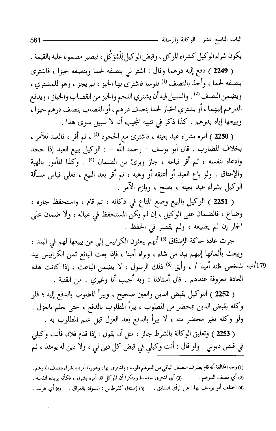 يكون شراء الوكيل كشراء الموكل وقبض الوكيل للموكل فيصير مضمونا عليه بالقيمة دفع إليه درهما وقال اشتر لي بنصفه لحما وبنصفه خبزا فاشترى بنصفه لحما وأخذ بالنصف فلوسا فاشترى بها الخبز لم يجز وهو للمشتري ويضمن النصف والسبيل فيه أن يشتري اللحم والخبز من القصاب والخباز ويدفع الدرهم إليهما أو يشتري الخباز لحما بنصف درهم أو القصاب بنصف درهم خبزا ويبيعها إياه بدرهم كذا ذكر في تنبيه المجيب أنه لا سبيل سوى هذا أمره بشراء عبد بعينه فاشترى مع الجحود ثم أقر فالعبد للآمر بخلاف المضارب قال أبو يوسف الوكيل يبيع العبد إذا جحد وادعاه لنفسه ثم أقر فباعه جاز وبرئ من الضمان وكذا المأمور بالهبة والإعتاق ولو باع العبد أو أعتقه أو وهبه ثم أقر بعد البيع فعلى قياس مسألة الوكيل شراء عبد بعينه يصح ويلزم الآمر الوكيل بالبيع وضع المتاع في دكانه ثم قام واستحفظ جاره وضاع فالضمان على الوكيل إن لم يكن المستحفظ في عياله ولا ضمان على الجار إن لم يضيعه ولم يقصر في الحفظ جرت عادة حاكة الرستاق إنهم يبعثون الكرابيس إلى من يبيعها لهم في البلد ويبعث بأثمانها إليهم بيد من شاء ويراه أمينا فإذا بعث البائع ثمن الكرابيس بيد شخص ظنه أمينا وأبق ذلك الرسول لا يضمن الباعث إذا كانت هذه العادة معروفة عندهم قال أستاذنا وبه أجيب أنا وغيري. من القنية. التوكيل بقبض الدين والعين صحيح ويبرأ المطلوب بالدفع إليه فلو وكله يقبض الدين بمحضر من المطلوب يبرأ المطلوب بالدفع حتى يعلم بالعزل ولو وكله بغير محضر منه لا يبرأ بالدفع بعد العزل قبل علم المطلوب به وتعليق الوكالة بالشرط جائز مثل أن يقول إذا قدم فلان فأنت وكيلي في قبض ديوني ولو قال أنت وكيلي في قبض كل دين لي ولا دين له يومئذ ثم