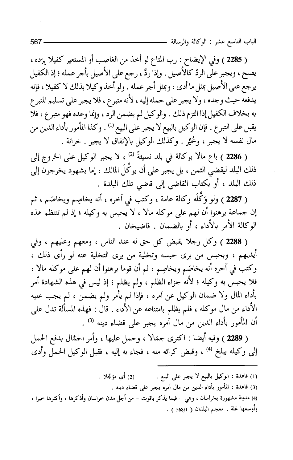 وفي الإيضاح رب المتاع لو أخذ من الغاصب أو المستعير كفيلا برده يصح ويجبر على الرد كالأصيل وإذا رد رجع على الأصيل بأجر عمله إذ الكفيل يرجع على الأصيل بمثل ما أدى وبمثل أجر عمله ولو أخذ وكيلا بذلك لا كفيلا فإنه يدفعه حيث وجده ولا يجبر على حمله إليه لأنه متبرع فلا يجبر على تسليم المتبرع به بخلاف الكفيل إذا التزم ذلك والوكيل لم يضمن الرد وإنما وعده فهو متبرع فلا يجبر على التبرع فإن الوكيل بالبيع لا يجبر على البيع وكذا المأمور بأداء الدين من مال نفسه لا يجبر ويخير وكذلك الوكيل بالإنفاق لا يجبر خزانة باع مالا بوكالة في بلد نسيئة لا يجبر الوكيل على الخروج إلى ذلك البلد ليقضي الثمن بل يجبر على أن يوكل المالك إما بشهود يخرجون إلى ذلك البلد أو بكتاب القاضي إلى قاضي تلك البلدة ولو وكله وكالة عامة وكتب في آخره أنه يخاصم ويخاصم ثم إن جماعة برهنوا أن لهم على موكله مالا لا يحبس به وكيله إذ لم تنتظم هذه الوكالة الأمر بالأداء أو بالضمان قاضي خان وكل رجلا بقبض كل حق له عند الناس ومعهم وعليهم وفي أيديهم وبحبس من يرى حبسه وتخلية عنه لو رأى ذلك وكتب في آخره أنه يخاصم ويخاصم ثم إن قوما برهنوا أن لهم على موكله مالا فلا يحبس به وكيله لأنه جزاء الظلم ولم يظلم إذ ليس في هذه الشهادة أمر بأداء المال ولا ضمان الوكيل عن آمره فإذا لم يأمر ولم يضمن لم يجب عليه الأداء من مال موكله فلم يظلم بامتناعه عن الأداء قال فهذه المسألة تدل على أن المأمور بأداء الدين من مال آمره يجبر على قضاء دينه وفيه أيضا اكترى جمالا وحمل عليها وأمر الجمال بدفع الحمل إلى وكيله ببلخ وقبض كرائه منه فجاء به إليه فقبل الوكيل الحمل وأدى