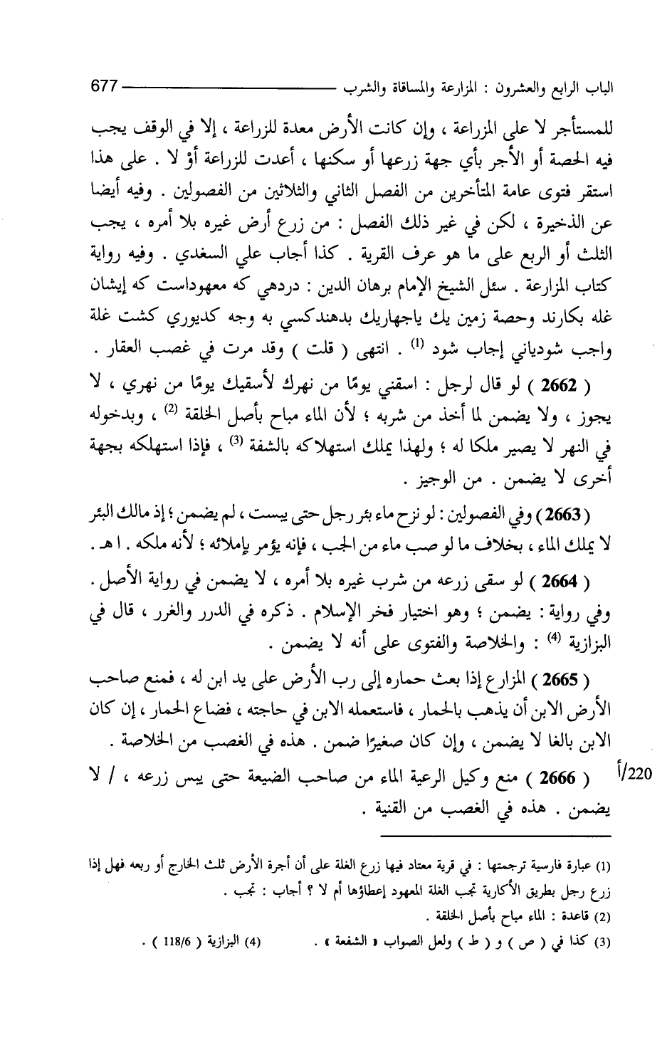للمستأجر لا على المزارعة وإن كانت الأرض معدة للزراعة إلا في الوقف يجب فيه الحصة أو بالأجر بأي جهة زرعها أو سكنها أعدت للزراعة أو لا على هذا استقر فتوى عامة المتأخرين من الفصل الثاني والثلاثين. من الفصولين. وفيه أيضا عن الذخيرة لكن في غير ذلك الفصل من زرع أرض غيره بلا أمره يجب الثلث أو الربع على ما هو عرف القرية كذا أجاب علي السغدي وفيه رواية كتاب المزارعة سئل الشيخ الإمام برهان الدين درديهي كه معهود ست كه ايشان غله صبكارند وحصة زمين سه يك يا جهاريك بد هند كسى به وجه كدبورى كشت غلة واجب شودياني أجاب شود انتهى قلت وقد مرت في غصب العقار لو قال لرجل اسقني يوما من نهرك لأسقيك يوما من نهري لا يجوز ولا يضمن لما أخذ من شربه لأن الماء مباح بأصل الخلقة وبدخوله في النهر لا يصير ملكا ولهذا يملك استهلاكه بالشفة فإذا استهلكه بجهة أخرى لا يضمن. من الوجيز. وفي الفصولين لو نزح ماء بئر رجل حتى يبست لم يضمن إذ مالك البئر لا يملك الماء بخلاف ما لو صب ماء من الجب فإنه يؤمر بإملائه لأنه ملكه ا هـ لو سقى زرعه من شرب غيره بلا أمره لا يضمن في رواية الأصل وفي رواية يضمن وهو اختيار فخر الإسلام ذكره في الدرر والغرر قال في البزازية والخلاصة والفتوى على أنه لا يضمن المزارع إذا بعث حماره إلى رب الأرض على يد ابن له فمنع صاحب الأرض الابن أن يذهب بالحمار فاستعمله الابن في حاجته فضاع الحمار إن كان الابن بالغا لا يضمن وإن كان صغيرا ضمن هذه في الغصب. من الخلاصة. منع وكيل الرعية الماء من صاحب الضيعة حتى يبس زرعه لا يضمن هذه في الغصب. من القنية.