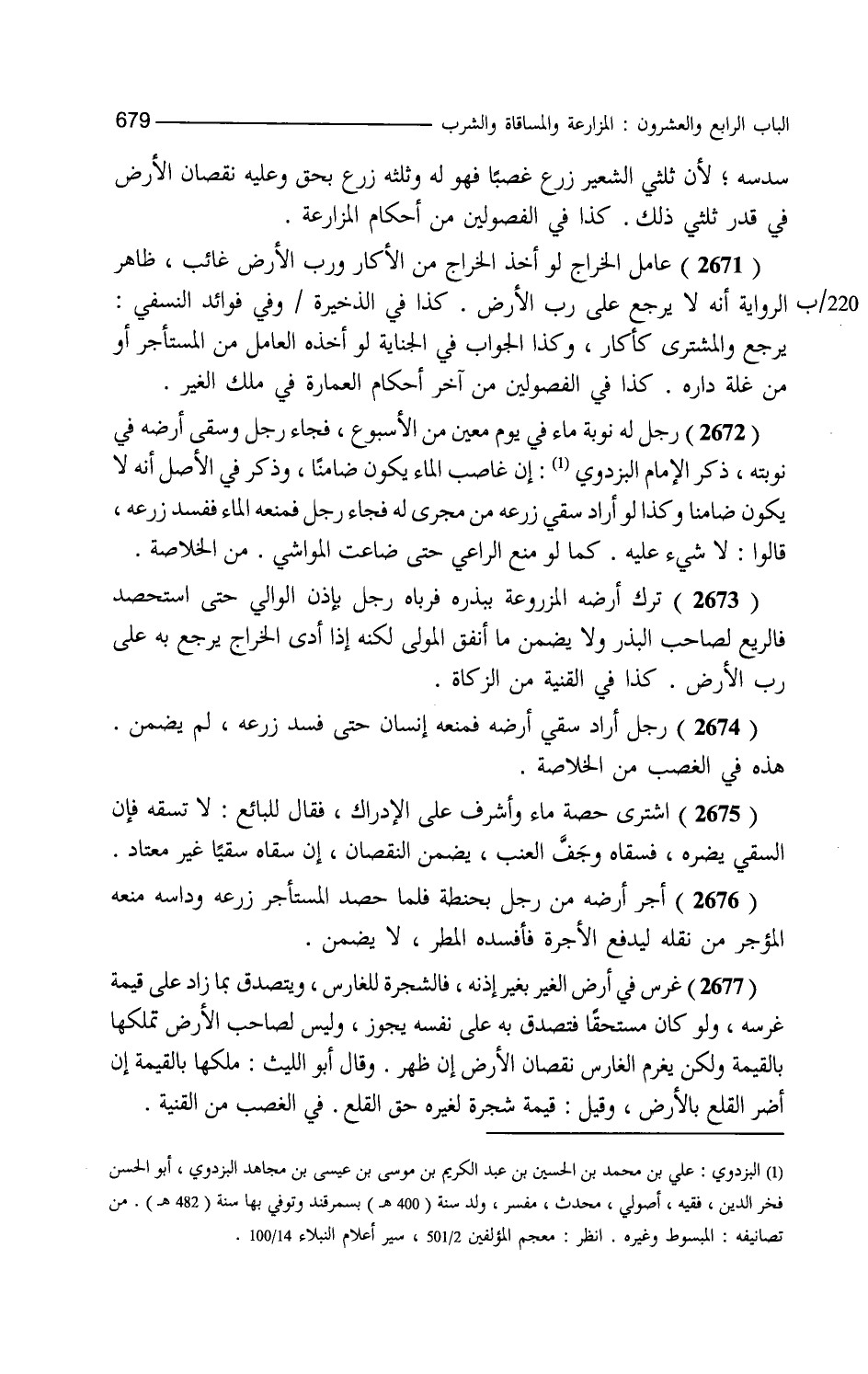سدسه لأن ثلثي الشعير زرع غصبا فهو له وثلثه زرع بحق وعليه نقصان الأرض في قدر ثلثي ذلك كذا في الفصولين من أحكام المزارعة عامل الخراج لو أخذ الخراج من الأكار ورب الأرض غائب ظاهر الرواية أنه لا يرجع على رب الأرض كذا في الذخيرة وفي فوائد النسفي يرجع والمشتري كأكار وكذا الجواب في الجباية لو أخذه العامل من المستأجر أو من غلة داره كذا في الفصولين من آخر أحكام العمارة في ملك الغير رجل له نوبة ماء في يوم معين من الأسبوع فجاء رجل وسقى أرضه في نوبته ذكر الإمام البزدوي أن غاصب الماء يكون ضامنا وذكر في الأصل أنه لا يكون ضامنا وكذا لو أراد سقي زرعه من مجرى له فجاء رجل فمنعه الماء ففسد زرعه قالوا لا شيء عليه كما لو منع الراعي حتى ضاعت المواشي. من الخلاصة. ترك أرضه المزروعة ببذره فرباه رجل بإذن الوالي حتى استحصد فالريع لصاحب البذر ولا يضمن ما أنفق المولى لكنه إذا أدى الخراج يرجع به على رب الأرض كذا في القنية من الزكاة رجل أراد سقي أرضه فمنعه إنسان حتى فسد زرعه لم يضمن هذه في الغصب. من الخلاصة. اشترى حصة ماء وأشرف على الإدراك فقال للبائع لا تسقه فإن السقي يضره فسقاه وجف العنب يضمن النقصان إن سقاه سقيا غير معتاد أجر أرضه من رجل بحنطة فلما حصد المستأجر زرعه وداسه منعه المؤجر من نقله ليدفع الأجرة فأفسده المطر لا يضمن غرس في أرض الغير بغير إذنه فالشجرة للغارس ويتصدق بما زاد على قيمة غرسه ولو كان مستحقا فتصدق به على نفسه يجوز وليس لصاحب الأرض تملكها بالقيمة ولكن يغرم الغارس نقصان الأرض إن ظهر وقال أبو الليث ملكها بالقيمة إن أضر القلع بالأرض وقيل قيمة شجرة لغيره حق القلع في الغصب. من القنية.