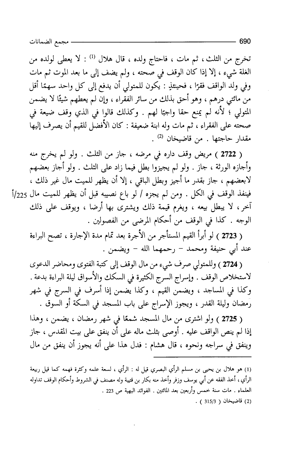 تخرج من الثلث ثم مات فاحتاج ولده قال هلال لا يعطى لولده من الغلة شيء إلا إذا كان الوقف في صحته ولم يضف إلى ما بعد الموت ثم مات وفي ولد الواقف فقراء فحينئذ يكون للمتولي أن يدفع إلى كل واحد سهما أقل من مائتي درهم وهو أحق بذلك من سائر الفقراء وإن لم يعطهم شيئا لا يضمن المتولي لأنه لم يمنع حقا واجبا لهم وكذلك قالوا في الذي وقف ضيعة في صحته على الفقراء ثم مات وله ابنة ضعيفة كان الأفضل للقيم أن يصرف إليها مقدار حاجتها. من قاضي خان. مريض وقف داره في مرضه جاز من الثلث ولو لم يخرج منه وأجازه الورثة جاز ولو لم يجيزوا بطل فيما زاد على الثلث ولو أجاز بعضهم لا بعضهم جاز بقدر ما أجيز وبطل الباقي إلا أن يظهر للميت مال غير ذلك فينفذ الوقف في الكل ومن لم يجزه لو باع نصيبه قبل أن يظهر للميت مال آخر لا يبطل بيعه ويغرم قيمة ذلك ويشتري بها أرضا ويوقف على ذلك الوجه كذا في الوقف من أحكام المرضى. من الفصولين. لو أبرأ القيم المستأجر من الأجرة بعد تمام مدة الإجارة تصح البراءة عند أبي حنيفة ومحمد ويضمن وللمتولي صرف شيء من مال الوقف إلى كتابة الفتوى ومحاضر الدعوى لاستخلاص الوقف وإسراج السرج الكثيرة في السكك والأسواق ليلة البراءة بدعة وكذا في المساجد ويضمن القيم وكذا يضمن إذا أسرف في السرج في شهر رمضان وليلة القدر ويجوز الإسراج على باب المسجد في السكة أو السوق ولو اشترى من مال المسجد شمعا في شهر رمضان يضمن وهذا إذا لم ينص الواقف عليه أوصى بثلث ماله على أن ينفق على بيت المقدس جاز وينفق في سراجه ونحوه قال هشام فدل هذا على أنه يجوز أن ينفق من مال