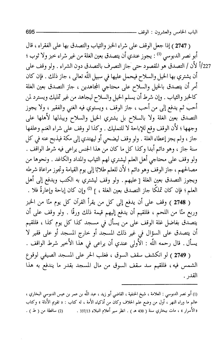 إذا جعل الوقف على شراء الخبز والثياب والتصدق بها على الفقراء قال أبو نصر الدبوسي يجوز عندي أن يتصدق بعين الغلة من غير شراء خبز ولا ثوب لأن التصدق هو المقصود حتى جاز التصرف بالتصدق دون الشراء ولو وقف على أن يشتري بها الخيل والسلاح فيحمل عليها في سبيل الله تعالى جاز ذلك فإن كان أمر أن يتصدق بالخيل والسلاح على محتاجي المجاهدين جاز التصدق بعين الغلة كالخبز والثياب وإن شرط أن يسلم الخيل والسلاح ليجاهد من غير تمليك ويسترد لمن أحب ثم يدفع إلى من أحب جاز الوقف ويستوي فيه الغني والفقير ولا يجوز التصدق بعين الغلة ولا بالسلاح بل يشتري الخيل والسلاح ويبذلها لأهلها على وجهها لأن الوقف وقع للإباحة لا للتمليك وكذا لو وقف على شراء الغنم وعلفها جاز ولم يجز إعطاء الغلة ولو وقف ليضحي أو ليهدي إلى مكة فيذبح عنه في كل سنة جاز وهو دائم أبدا وكذا كل ما كان من هذا الجنس يراعى فيه شرط الواقف ولو وقف على محتاجي أهل العلم ليشتري لهم الثياب والمداد والكاغد ونحوها من مصالحهم جاز الوقف وهو دائم لأن للعلم طلابا إلى يوم القيامة وتجوز مراعاة شرطه ويجوز التصدق بعين الغلة وإن كان إباحة وإعارة فلا وقف على أن يدفع إلى كل من يقرأ القرآن كل يوم من من الخبز وربع من من اللحم فللقيم أن يدفع إليهم قيمة ذلك ورقا ولو وقف على أن يتصدق بفاضل غلة الوقف على من يسأل في مسجد كذا كل يوم كذا فللقيم أن يتصدق على السؤال في غير ذلك المسجد أو خارج المسجد أو على فقير لا يسأل قال رحمه الله الأولى عندي أن يراعي في هذا الأخير شرط الواقف لو انكشف سقف السوق فغلب الحر على المسجد الصيفي لوقوع الشمس فيه فللقيم سد سقف السوق من مال المسجد بقدر ما يندفع به هذا القدر