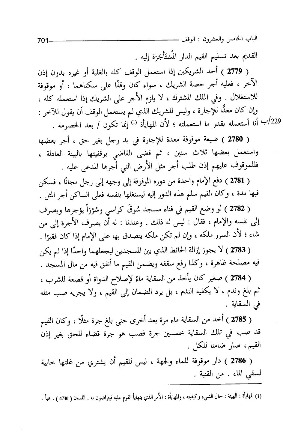 القديم بعد تسليم القيم الدار المستأجرة إليه أحد الشريكين إذا استعمل الوقف كله بالغلبة أو غيره بدون إذن الآخر فعليه أجر حصة الشريك سواء كان وقفا على سكناهما أو موقوفة للاستغلال وفي الملك المشترك لا يلزم الأجر على الشريك إذا استعمله كله وإن كان معدا للإجارة وليس للشريك الذي لم يستعمل الوقف أن يقول للآخر أنا أستعمله بقدر ما استعملته لأن المهايأة إنما تكون بعد الخصومة ضيعة موقوفة معدة للإجارة في يد رجل بغير حق أجر بعضها واستعمل بعضها ثلاث سنين ثم قضى القاضي بوقفيتها بالبينة العادلة فللموقوف عليهم إذن طلب أجر مثل الأرض التي أجرها المدعى عليه دفع الإمام واحدة من الدور الموقوفة إلى وجهه إلى رجل مجانا فسكن فيها مدة وكان القيم سلم هذه الدور إليه ليستغلها بنفسه فعلى الساكن أجر المثل ولو وضع القيم في فناء مسجد سوق كراسي وسررا يؤاجرها ويصرف إلى نفسه والإمام فقال ليس له ذلك وعندنا له أن يصرف الأجرة إلى من شاء لأن السرر ملكه وإن لم تكن ملكه يتصدق بها على الإمام إذا كان فقيرا لا يجوز إزالة الحائط الذي بين المسجدين ليجعلهما واحدا إذا لم يكن فيه مصلحة ظاهرة وكذا رفع سقفه ويضمن القيم ما أنفق فيه من مال المسجد صغير كان يأخذ من السقاية ماء لإصلاح الدواة أو قصعة للشرب ثم بلغ وندم لا يكفيه الندم بل يرد الضمان إلى القيم ولا يجزيه صب مثله في السقاية أخذ من السقاية ماء مرة بعد أخرى حتى بلغ جرة مثلا وكان القيم قد صب في تلك السقاية خمسين جرة فصب هو جرة قضاء للحق بغير إذن القيم صار ضامنا للكل دار موقوفة للماء ولجهة ليس للقيم أن يشتري من غلتها خابية لسقي الماء. من القنية.