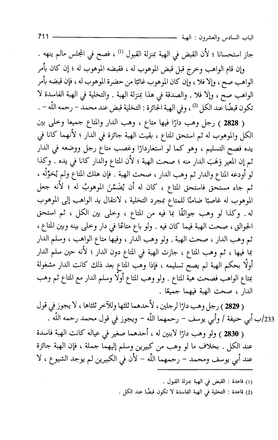جاز استحسانا لأن القبض في الهبة بمنزلة القبول فصح في المجلس ما لم ينهه وإن قام الواهب وخرج قبل قبض الموهوب له فقبضه الموهوب له إن كان بأمر الواهب صح وإلا فلا والصدقة في هذا بمنزلة الهبة والتخلية في الهبة الفاسدة لا تكون قبضا عند الكل وفي الهبة الجائزة التخلية قبض عند محمد رجل وهب دارا فيها متاع وهب الدار والمتاع جميعا وخلى بين الكل والموهوب له ثم استحق المتاع بقيت الهبة جائزة في الدار لأنهما كانا في يده فصح التسليم وهو كما لو استعار دارا وغصب متاع رجل ووضعه في الدار ثم إن المعير وهب الدار منه صحت الهبة لأن المتاع والدار كانا في يده وكذا لو أودعه المتاع والدار ثم وهب الدار صحت الهبة فإن هلك المتاع ولم يحوله ثم جاء مستحق فاستحق المتاع كان له أن يضمن الموهوب له لأنه جعل الموهوب له غاصبا ضامنا للمتاع بمجرد التخلية لانتقال يد الواهب إلى الموهوب له وكذا لو وهب جوالقا بما فيه من المتاع وخلى بين الكل ثم استحق الجوالق صحت الهبة فيما كان فيه ولو باع متاعا في دار وخلى بينه وبين المتاع ثم وهب الدار صحت الهبة ولو وهب الدار وفيها متاع الواهب وسلم الدار بما فيها ثم وهب المتاع جازت الهبة في المتاع دون الدار لأنه حين سلم الدار أولا بحكم الهبة لم يصح تسليمه فإذا وهب المتاع بعد ذلك كانت الدار مشغولة بمتاع الواهب فصحت هبة المتاع ولو وهب المتاع أولا ثم وهب الدار صحت الهبة فيهما جميعا رجل وهب دارا لرجلين لأحدهما ثلثها وللآخر ثلثاها لا يجوز في قول أبي حنيفة وأبي يوسف ويجوز في قول محمد ولو وهب دارا لابنين له أحدهما صغير في عياله كانت الهبة فاسدة عند الكل بخلاف ما لو وهب من كبيرين وسلم إليهما جملة فإن الهبة جائزة عند أبي يوسف ومحمد لأن في الكبيرين لم يوجد الشيوع لا