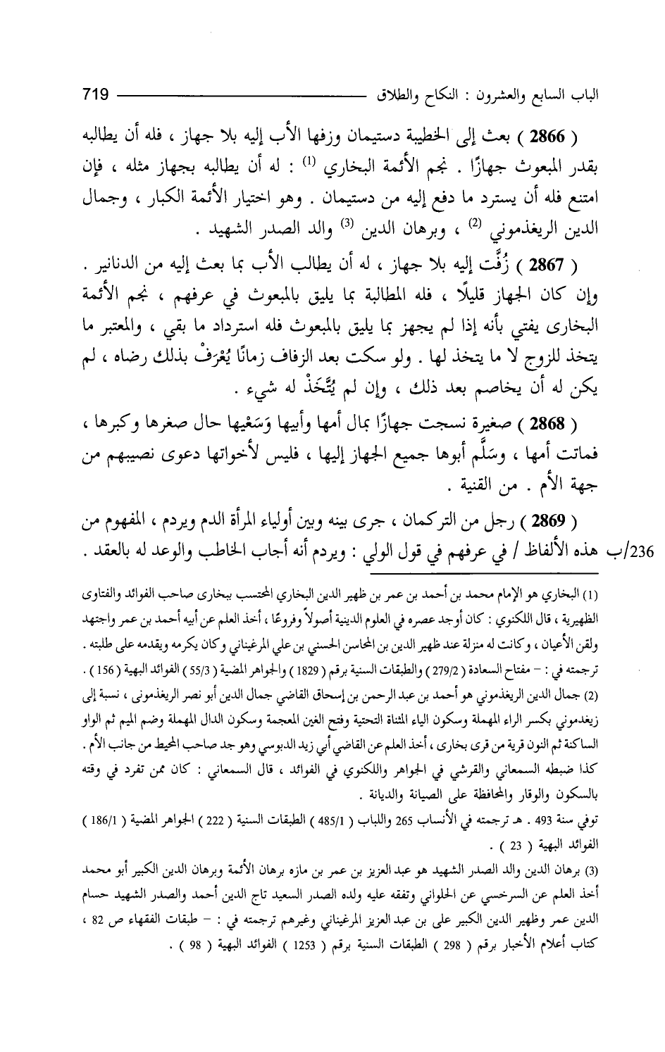 بعث إلى الخطيبة دستيمان وزفها الأب إليه بلا جهاز فله أن يطالبه بقدر المبعوث جهازا نجم الأئمة البخاري له أن يطالبه بجهاز مثله فإن امتنع فله أن يسترد ما دفع إليه من دستيمان وهو اختيار الأئمة الكبار وجمال الدين الزيغد مولى وبرهان الدين والد الصدر الشهيد زفت إليه بلا جهاز له أن يطالب الأب بما بعث إليه من الدنانير وإن كان الجهاز قليلا فله المطالبة بما يليق بالمبعوث في عرفهم نجم الأئمة البخاري يفتي بأنه إذا لم يجهز بما يليق بالمبعوث فله استرداد ما بقي والمعتبر ما يتخذ للزوج لا ما يتخذ لها ولو سكت بعد الزفاف زمانا يعرف بذلك رضاه لم يكن له أن يخاصم بعد ذلك وإن لم يتخذ له شيء صغيرة نسجت جهازا بمال أمها وأبيها وسعيها حال صغرها وكبرها فماتت أمها وسلم أبوها جميع الجهاز إليها فليس لأخواتها دعوى نصيبهم من جهة الأم. من القنية. رجل من التركمان جرى بينه وبين أولياء المرأة الدم ويردم المفهوم من هذه الألفاظ في عرفهم في قول الولي ويردم أنه إجابة الخاطب والوعد له بالعقد