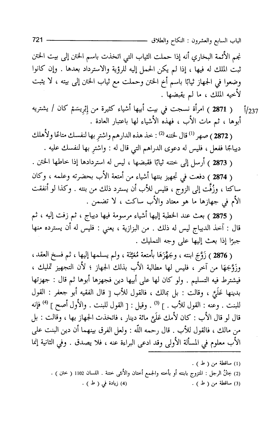 نجم الأئمة البخاري إنه إذا حملت الثياب التي اتخذت باسم الختن إلى بيت الختن ثبت الملك له فيها إذا لم يكن الحمل إليه للرؤية والاسترداد بعدها وإن كان وضعوا في الجهاز ثيابا باسم أخ الختن وحملت مع ثياب الختن إلى بيته لا يثبت لأخيه الملك ما لم يقبضها امرأة نسجت في بيت أبيها أشياء كثيرة من إبريسم كان يشتريه أبوها ثم مات الأب فهذه الأشياء لها باعتبار العادة قال لختنه خذ هذه الدراهم واشتر بها لنفسك متاعا ولأهلك ديباجا ففعل فليس له دعوى الدراهم التي قال له واشتر بها لنفسك عليه أرسل إلى ختنه ثيابا فقبضها ليس له استردادها إذا خاطها الختن دفعت في تجهيز بنتها أشياء من أمتعة الأب بحضرته وعلمه وكان ساكتا وزفت إلى الزوج فليس للأب أن يسترد ذلك من بنته وكذا لو أنفقت الأم في جهازها ما هو معتاد والأب ساكت لا تضمن بعث عند الخطبة إليها أشياء مرسومة فيها ديباج ثم زفت إليه ثم قال آخذ الديباج ليس له ذلك . من البزازية. يعني فليس له أن يسترده منها جبرا إذا بعث إليها على وجه التمليك زوج ابنته وجهزها بأمتعة معينة ولم يسلمها إليها ثم فسخ العقد وزوجها من آخر فليس لها مطالبة الأب بذلك الجهاز لأن التجهيز تمليك فيشترط فيه التسليم ولو كان لها على أبيها دين فجهزها ثم قال جهزتها بما لها علي وقالت بل بمالك فالقول للأب وقيل القول للبنت والأول أصح فإنه لو قال الأب كان لأمك علي مائة دينار فاتخذت الجهاز بها وقالت بل من مالك فالقول للأب قال رحمه الله ولعل الفرق بينهما أن دين البنت على الأب معلوم في المسألة الأولى وقد ادعى البراءة عنه فلا يصدق وفي الثانية إنما