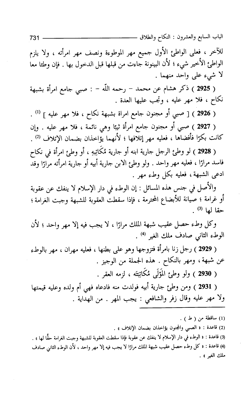 منهما للآخر فعلى الواطئ الأول جميع مهر الموطوءة ونصف مهر امرأته ولا يلزم الواطئ الأخير شيء لأن البينونة جاءت من قبلها قبل الدخول بها فإن وطئا معا لا شيء على واحد منهما ذكر هشام عن محمد صبي جامع امرأة بشبهة نكاح فلا مهر عليها وتجب عليها العدة صبي أو مجنون جامع امرأة ثيبا وهي نائمة فلا مهر عليه وإن كانت بكرا فأفضاها فعليه مهر إتلافها لأنهما يؤاخذان بضمان الإتلاف لو وطئ الرجل جارية ابنه أو جارية مكاتبه أو وطئ امرأة في نكاح فاسد مرارا فعليه مهر واحد ولو وطئ الابن جارية أبيه أو جارية امرأته مرارا وقد ادعى الشبهة فعليه بكل وطء مهر والأصل في جنس هذه المسائل أن الوطء في دار الإسلام لا ينفك عن عقوبة أو غرامة صيانة للأبضاع المحترمة فإذا سقطت العقوبة للشبهة وجبت الغرامة حقا لها وكل وطء حصل عقيب شبهة الملك مرارا لا يجب فيه إلا مهر واحد لأن الوطء الثاني صادف ملك الغير رجل زنى بامرأة فتزوجها وهو على بطنها فعليه مهران مهر بالوطء عن شبهة ومهر بالنكاح هذه الجملة من الوجيز