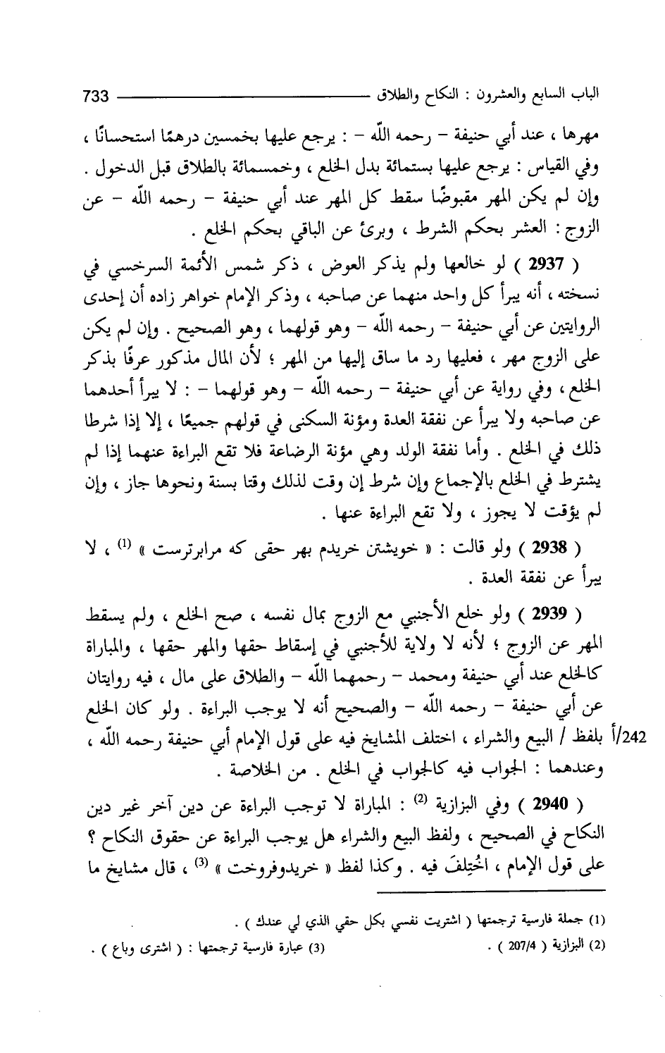مهرها عند أبي حنيفة سقط رحمه الله يرجع عليها بخمسين درهما استحسانا وفي القياس يرجع عليها بمائة بدل الخلع وخمسمائة بالطلاق قبل الدخول وإن لم يكن المهر مقبوضا سقط كل المهر عند أبي حنيفة عن الزوج العشر بحكم الشرط وبرئ عن الباقي بحكم الخلع لو خالعها ولم يذكر العوض ذكر شمس الأئمة السرخسي في نسخته إنه يبرأ كل واحد منهما عن صاحبه وذكر الإمام خواهر زاده إن هذا إحدى الروايتين عن أبي حنيفة وهو قولهما وهو الصحيح وإن لم يكن على الزوج مهر فعليها رد ما ساق إليها من المهر لأن المال مذكور عرفا بذكر الخلع وفي رواية عن أبي حنيفة وهو قولهما لا يبرأ أحدهما عن صاحبه ولا يبرأ عن نفقة العدة ومؤنة السكنى في قولهم جميعا إلا إذا شرط ذلك في الخلع وأما نفقة الولد وهي مؤنة الرضاع فلا تقع البراءة عنها إذا لم يشترط مع الخلع بالإجماع وإن شرط إن وقت لذلك وقتا بسنة ونحوها جاز وإن لم يوقت لا يجوز ولا تقع البراءة عنها ولو قالت خوشين حريدم بهر حقي كه مرا بر ترست لا يبرأ عن نفقة العدة ولو خلع الأجنبي مع الزوج بمال نفسه صح الخلع ولم يسقط المهر عن الزوج لأنه لا ولاية للأجنبي في إسقاط حقها والمهر حقها والمباراة كالخلع عند أبي حنيفة ومحمد والطلاق على مال فيه روايتان عن أبي حنيفة والصحيح أنه لا يوجب البراءة ولو كان الخلع بلفظ البيع والشراء اختلف المشايخ فيه على قول الإمام أبي حنيفة وعندهما الجواب فيه كالجواب في الخلع. من الخلاصة. وفي البزازية المبارأة لا توجب البراءة عن دين آخر غير دين النكاح في الصحيح ولفظ البيع والشراء هل يوجب البراءة عن حقوق النكاح على قول الإمام اختلف فيه وكذا لفظ خريد وفروخت قال مشايخ ما