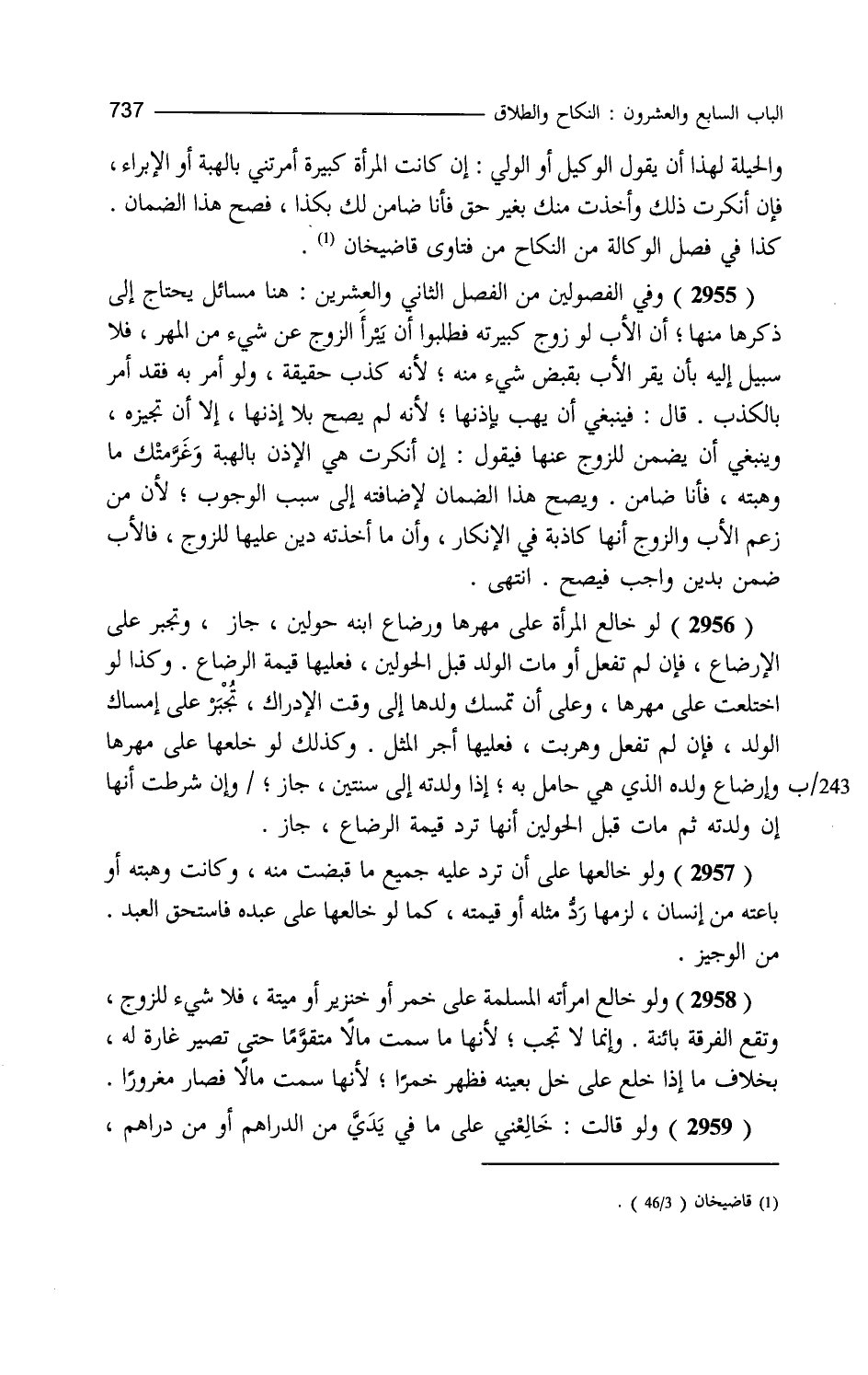 وفي الفصولين من الفصل الثاني والعشرين هنا مسائل يحتاج إلى ذكرها منها أن الأب لو زوج كبيرته فطلبوا أن يبرأ الزوج عن شيء من المهر فلا سبيل إليه بأن يقر الأب بقبض شيء منه لأنه كذب حقيقة ومن أمر به فقد أمر بالكذب قال فينبغي أن يهب بإذنها لأنه لا يصح بلا إذنها إلا أن تجيزه وينبغي أن يضمن للزوج عنها فيقول إن أنكرت هي الإذن بالهبة وغرمتك ما وهبته فأنا ضامن ويصح هذا الضمان لإضافته إلى سبب الوجوب لأن من زعم الأب والزوج أنها كاذبة في الإنكار وأن ما أخذته دين عليها للزوج فالأب ضمن بدين واجب فيصح انتهى لو خالع المرأة على مهرها ورضاع ابنه حولين جاز وتجبر على الإرضاع فإن لم تفعل أو مات الولد قبل الحولين فعليها قيمة الرضاع وكذا لو اختلعت على مهرها وعلى أن تمسك ولدها إلى وقت الإدراك تجبر على إمساك الولد فإن لم تفعل وهربت فعليها أجر المثل وكذلك لو خلعها على مهرها وإرضاع ولده الذي هي حامل به إذا ولدته إلى سنتين جاز وإن شرطت أنها إن ولدته ثم مات قبل الحولين أنها ترد قيمة الرضاع جاز ولو خالعها على أن ترد عليه جميع ما قبضت منه وكانت وهبته أو باعته من إنسان لزمها رد مثله أو قيمته كما لو خالعها على عبده فاستحق العبد. من الوجيز. ولو خالع امرأته المسلمة على خمر أو خنزير أو ميتة فلا شيء للزوج وتقع الفرقة بائنة وإنما لا تجب لأنها ما سمت مالا متقوما حتى تصير غارة له بخلاف ما إذا خلع على خل بعينه فظهر خمرا لأنها سمت مالا فصار مغرورا ولو قالت خالعني على ما في يدي من الدراهم أو من دراهم
