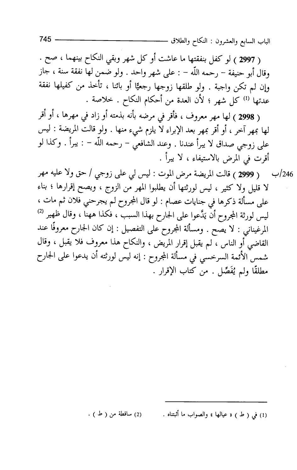 لو كفل بنفقتها ما عاشت أو كل شهر وبقي النكاح بينهما صح وقال أبو حنيفة على شهر واحد ولو ضمن لها نفقة سنة جاز وإن لم تكن واجبة ولو طلقها زوجها رجعيا أو بائنا تأخذ من كفيلها نفقة عيالها كل شهر لأن العدة من أحكام النكاح خلاصة لها مهر معروف فأقر في مرضه بأنه بذمته أو زاد في مهرها أو أقر لها بمهر آخر أو أقر بمهر بعد الإبراء لا يلزم شيء منها ولو قالت المريضة ليس على زوجي صداق لا يبرأ عندنا وعند الشافعي يبرأ وكذا لو أقرت في المرض بالاستيفاء لا يبرأ قالت المريضة مرض الموت ليس لي على زوجي حق ولا عليه مهر لا قليل ولا كثير ليس لورثتها أن يطلبوا المهر من الزوج ويصح إقرارها بناء على مسألة ذكرها في جنايات عصام لو قال المجروح لم يجرحني فلان ثم مات ليس لورثة المجروح أن يدعوا على الجارح بهذا السبب فكذا هاهنا وقال المرغيناني لا يصح ومسألة المجروح على التفصيل إن كان الجارح معروفا عند القاضي والناس لم يقبل إقرار المريض والنكاح هذا معروف فلا يقبل وقال شمس الأئمة السرخسي في مسألة المجروح إنه ليس لورثته أن يدعوا على الجارح مطلقا ولم يفصل من كتاب الإقرار