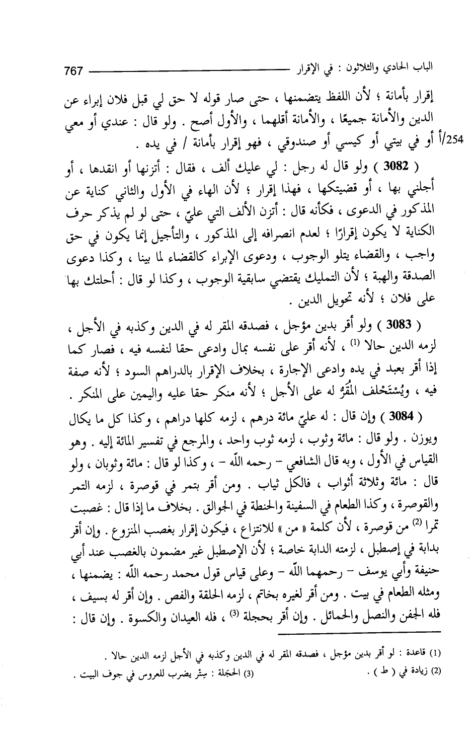 إقرار بأمانة لأن اللفظ يتضمنها حتى صار قوله لا حق لي قبل فلان إبراء عن الدين والأمانة جميعا والأمانة أقلهما والأول أصح ولو قال عندي أو معي أو في بيتي أو كيسي أو صندوقي فهو إقرار بأمانة في يده ولو قال له رجل لي عليك ألف فقال أتزنها أو أنقدها أو أجلني بها أو قضيتكها فهذا إقرار لأن الهاء في الأول والثاني كناية عن المذكور في الدعوى فكأنه قال اتزن الألف التي علي حتى لو لم يذكر حرف الكناية لا يكون إقرارا لعدم انصرافه إلى المذكور والتأجيل إنما يكون في حق واجب والقضاء يتلو الوجوب ودعوى الإبراء كالقضاء لما بينا وكذا دعوى الصدقة والهبة لأن التمليك يقتضي سابقية الوجوب وكذا لو قال أحلتك بها على فلان لأنه تحويل الدين ولو أقر بدين مؤجل فصدقه المقر له في الدين وكذبه في الأجل لزمه الدين حالا لأنه أقر على نفسه بمال وادعى حقا لنفسه فيه فصار كما إذا أقر بعبد في يده وادعى الإجارة بخلاف الإقرار بالدراهم السود لأنه صفة فيه ويستحلف المقر له على الأجل لأنه منكر حقا عليه واليمين على المنكر وإن قال له علي مائة درهم لزمه كلها دراهم وكذا كل ما يكال ويوزن ولو قال مائة وثوب لزمه ثوب واحد والمرجع في تفسير المائة إليه وهو القياس في الأول وبه قال الشافعي وكذا لو قال مائة وثوبان ولو قال مائة وثلاثة أثواب فالكل ثياب ومن أقر بتمر في قوصرة لزمه التمر والقوصرة وكذا الطعام في السفينة والحنطة في الجوالق بخلاف ما إذا قال غصبت تمرا في قوصرة لأن كلمة من للانتزاع فيكون إقرارا بغصب المنزوع وإن أقر بدابة في إصطبل لزمته الدابة خاصة لأن الإصطبل غير مضمون بالغصب عند أبي حنيفة وأبي يوسف وعلى قياس قول محمد يضمنهما ومثله الطعام في بيت ومن أقر لغيره بخاتم لزمه الحلقة والفص وإن أقر له بسيف فله الجفن والنصل والحمائل وإن أقر بحجلة فله العيدان والكسوة وإن قال