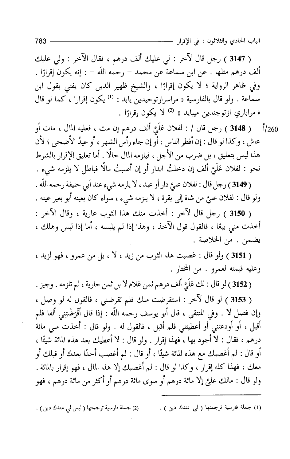 رجل قال لآخر لي عليك ألف درهم فقال الآخر ولي عليك ألف درهم مثلها عن ابن سماعة عن محمد أنه يكون إقرارا وفي ظاهر الرواية لا يكون إقرارا والشيخ ظهير الدين كان يفتي بقول ابن سماعة ولو قال بالفارسية مراسراز توحيدين يابد يكون إقرارا كما لو قال مرا باري أزتوجندين ميبايد لا يكون إقرارا رجل قال لفلان علي ألف درهم إن مت فعليه المال مات أو عاش وكذا لو قال إن أفطر الناس أو إن جاء رأس الشهر أو عيد الأضحى لأن هذا ليس بتعليق بل ضرب من الأجل فيلزمه المال حالا أما تعليق الإقرار بالشرط نحو لفلان علي ألف إن دخلت الدار أو إن أصبت مالا فباطل لا يلزمه شيء رجل قال لفلان علي دار أو عبد لا يلزمه شيء عند أبي حنيفة ولو قال لفلان علي من شاة إلى بقرة لا يلزمه شيء سواء كان بعينه أو بغير عينه رجل قال لآخر أخذت منك هذا الثوب عارية وقال الآخر أخذت مني بيعا فالقول قول الآخذ وهذا إذا لم يلبسه أما إذا لبس وهلك يضمن. من الخلاصة. ولو قال غصبت هذا الثوب من زيد لا بل من عمرو فهو لزيد وعليه قيمته لعمرو من المختار ولو قال لك علي ألف درهم ثمن جارية لم تلزمه وجيز لو قال لآخر استقرضت منك فلم تقرضني فالقول له لو وصل وإن فصل لا وفي المنتقى قال أبو يوسف إذا قال أقرضتني ألفا فلم أقبل أو أودعتني أو أعطيتني فلم أقبل فالقول له ولو قال أخذت مني مائة درهم فقال لا أجود بها فهذا إقرار ولو قال لا أعطيك بعد هذه المائة شيئا أو قال لم أغصبك مع هذه المائة شيئا أو قال لم أغصب أحدا بعدك أو قبلك أو معك فهذا كله إقرار وكذا لو قال لم أغصبك إلا هذا المال فهو