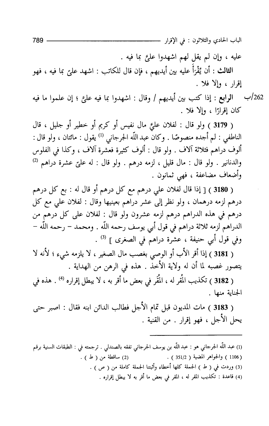 ا عليه وإن لم يقل لهم اشهدوا علي بما فيه الثالث أن يقرأ عليه بين أيديهم فإن قال للكاتب اشهد علي بما فيه فهو إقرار وإلا فلا الرابع إذا كتب بين أيديهم وقال اشهدوا بما فيه علي إن علموا ما فيه كان إقرارا وإلا فلا ولو قال لفلان علي مال نفيس أو كريم أو خطير أو جليل قال الناطفي لم أجده منصوبا وكان عبد الله الجرجاني يقول مائتان ولو قال ألوف دراهم فثلاثة آلاف ولو قال ألوف كثيرة فعشرة آلاف وكذا في الفلوس والدنانير ولو قال مال قليل لزمه درهم ولو قال له علي عشرة وأضعاف مضاعفة فهي ثمانون إذا قال لفلان علي دراهم مع كل درهم أو قال مع كل درهم من هذه الدراهم درهم لزمه عشرون ولو قال هذه الدراهم لزمه أحد عشر درهما ولو قال لفلان علي كل درهم من هذه الدراهم لزمه ثلاثة دراهم في قول أبي يوسف ومحمد في قول أبي حنيفة عشرة دراهم . من الصغرى. إذا أقر الأب أو الوصي بغصب مال الصغير لا يلزمه شيء لأنه لا يتصور غصبه لما أن له ولاية الأخذ هذه في الرهن. من الهداية. تكذيب المقر له المقر في بعض ما أقر به لا يبطل إقراره هذه في الجناية منها مات المديون قبل تمام الأجل فطالب الدائن ابنه فقال اصبر حتى يحل الأجل فهو إقرار. من القنية.