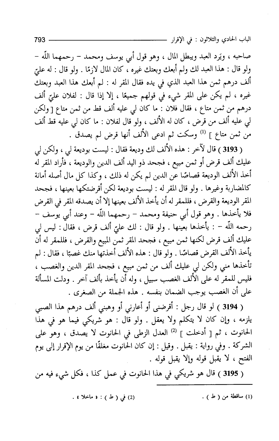 صاحبه ويرد العبد ويبطل المال وهو قول أبي يوسف ومحمد ولو قال هذا العبد لك ولم أبعك وبعتك غيره كان المال لازما ولو قال علي ألف درهم من ثمن هذا العبد الذي في يده فقال المقر له لم أبعك هذا العبد وبعتك غيره لم يكن على المقر شيء في قولهم جميعا إلا إذا قال لفلان علي ألف درهم من ثمن متاع فقال فلان ما كان لي عليه ألف قط من ثمن متاع وسكت ثم ادعى الألف أنها قرض لم يصدق قال لآخر هذه الألف لك وديعة فقال ليست بوديعة لي ولكن لي عليك ألف قرض أو ثمن مبيع فجحد ذو اليد ألف الدين الوديعة فأراد المقر له أخذ الألف الوديعة قصاصا عن الدين لم يكن له ذلك وكذا كل مال أصله أمانة كالمضاربة وغيرها ولو قال المقر له ليست بوديعة لكن أقرضتكها بعينها فجحد المقر الوديعة والقرض فللمقر له أن يأخذ الألف بعينها إلا أن يصدقه في القرض فلا يأخذها وهو قول أبي حنيفة ومحمد وعند أبي يوسف يأخذها بعينها ولو قال لك علي ألف قرض فقال ليس لي عليك ألف قرض لكنها ثمن مبيع فجحد المقر ثمن المبيع والقرض فللمقر له أن يأخذ الألف القرض قصاصا ولو قال هذه الألف أخذتها منك غصبا فقال لم تأخذها مني ولكن لي عليك ألف من ثمن مبيع فجحد المقر الدين والغصب فليس للمقر له على الألف الغصب سبيل وله أن يأخذ بألف آخر ودلت المسألة على أن الغصب يوجب الضمان بنفسه هذه الجملة . من الصغرى. لو قال رجل أقرضني أو أعارني أو وهبني ألف درهم هذا الصبي يلزمه وإن كان لا يتكلم ولا يعقل ولو قال هو شريكي فيما هو في هذا الحانوت ثم قال ما خلا العدل الزطي في الحانوت لا يصدق وهو على الشركة وفي رواية يقبل وقيل إن كان الحانوت مغلقا من يوم الإقرار إلى يوم الفتح لا يقبل قوله وإلا يقبل قوله قال هو شريكي في هذا الحانوت في عمل كذا فكل شيء فيه من